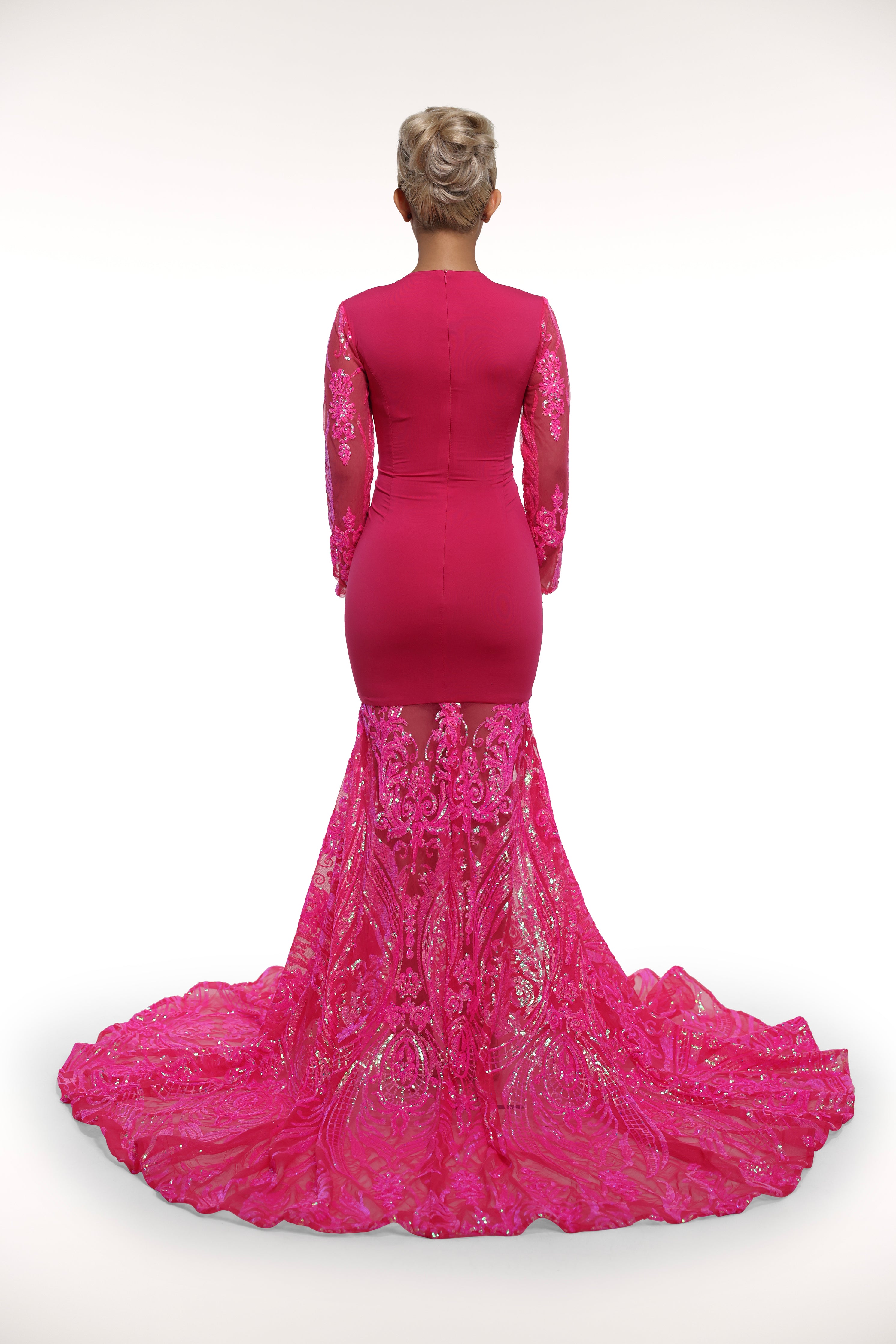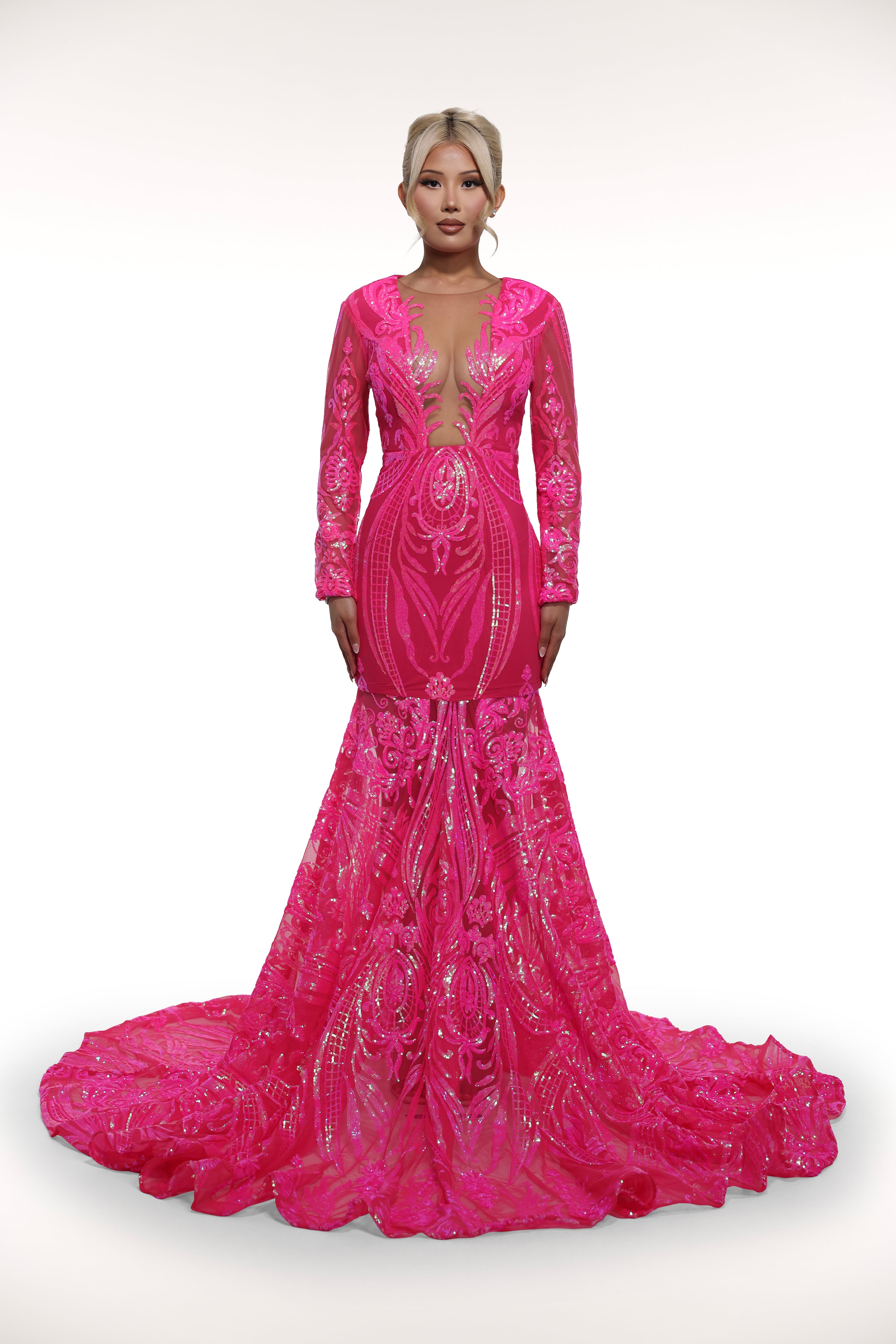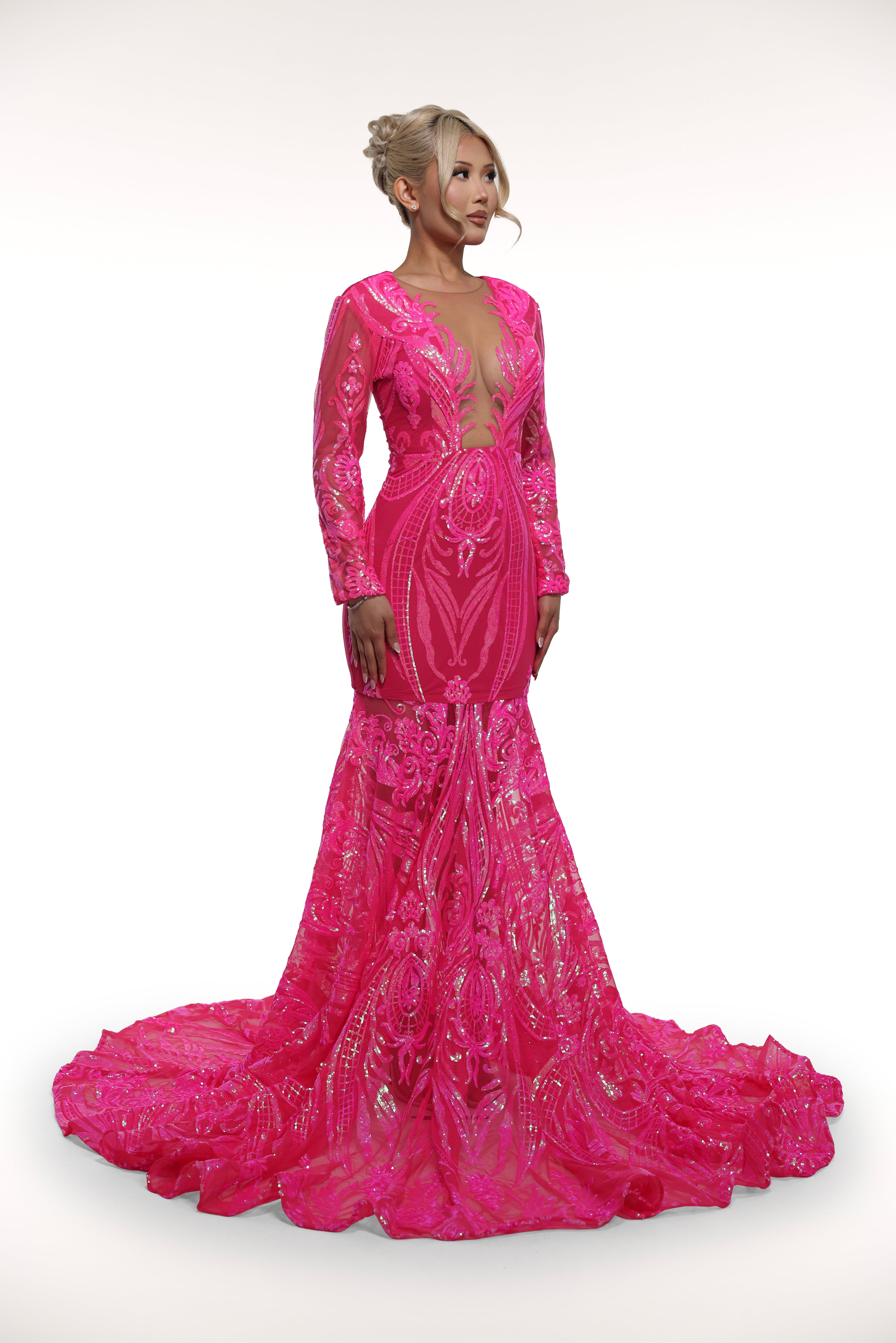 This elegant 'Tyra Gown' features a stunning sequin pattern and long sleeves. The plunging neckline is lined with mesh for a sophisticated touch.
