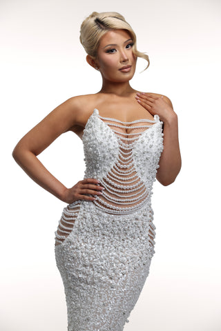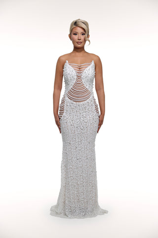 A model poses in a shimmering purple gown with intricate details, reflected in an ornate mirror against a plain white wall