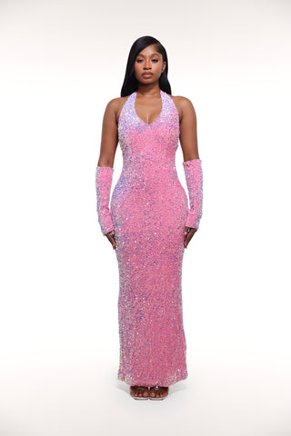 A woman in a shimmering purple evening gown poses elegantly in front of a large ornate mirror, showcasing the dress's intricate details