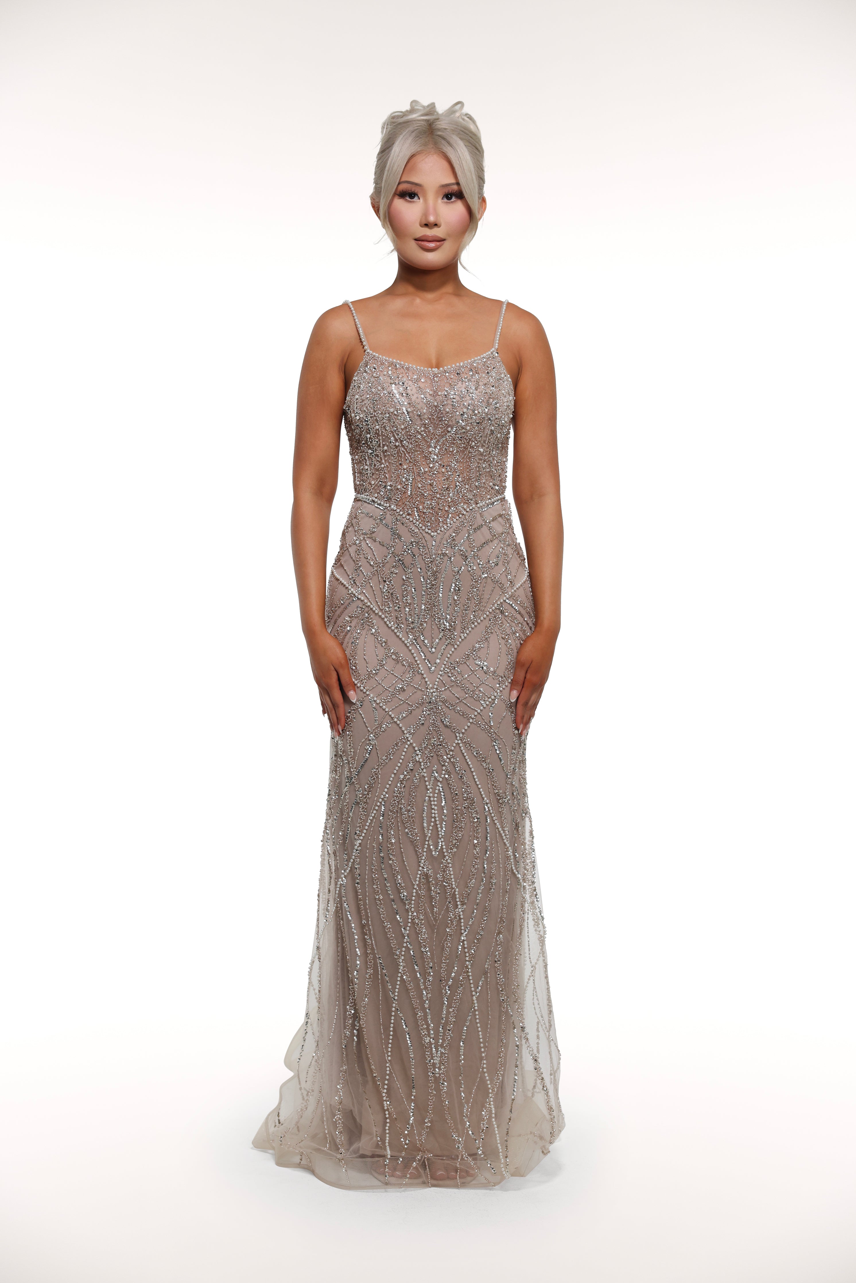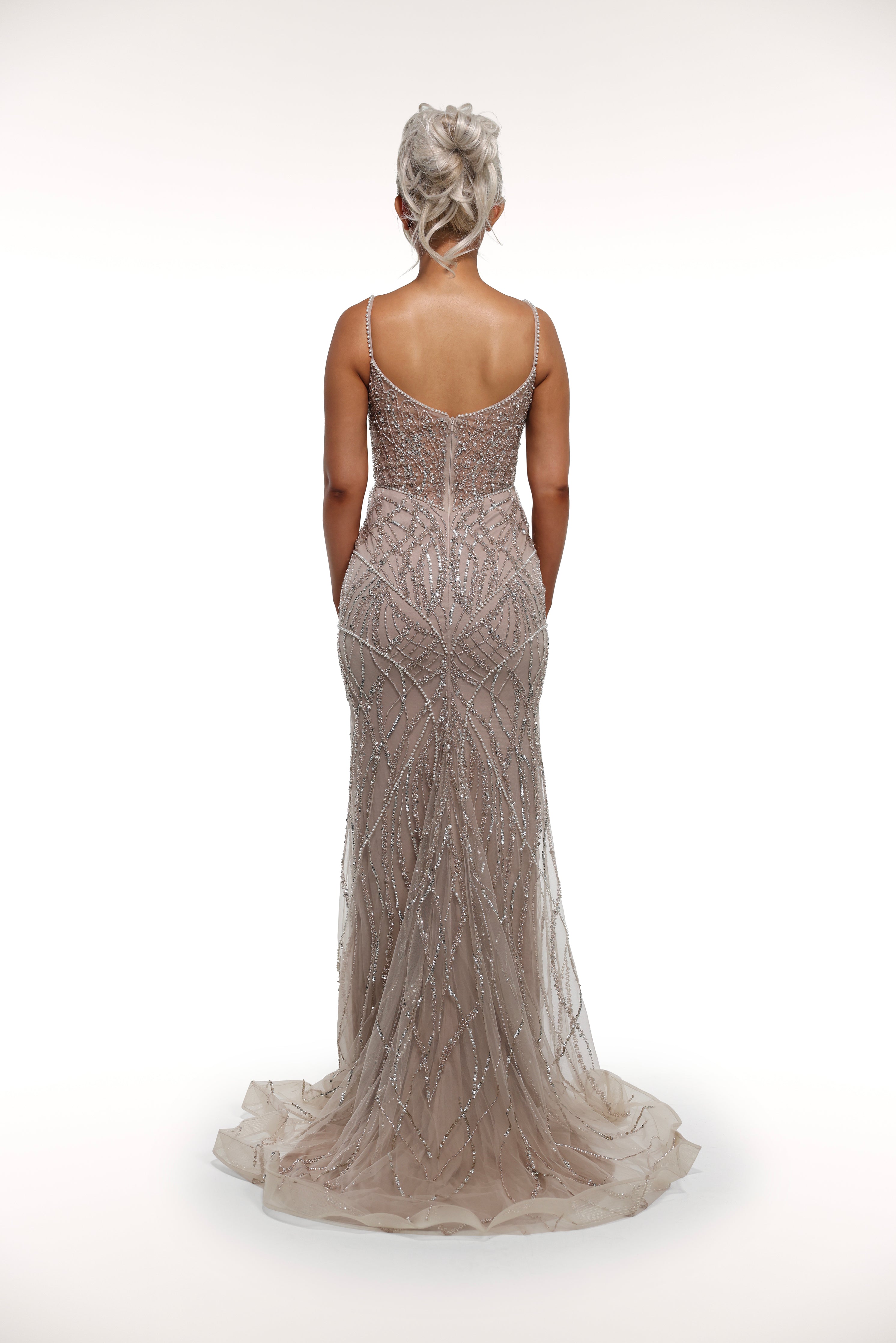This 'Pearlina' gown is a true show-stopper with its intricate embellishments with gems and pearls throughout, sparkling silver crystals, adding the perfect touch of glamour. Perfect for a special occasion or formal event, this dress exudes elegance and sophistication.