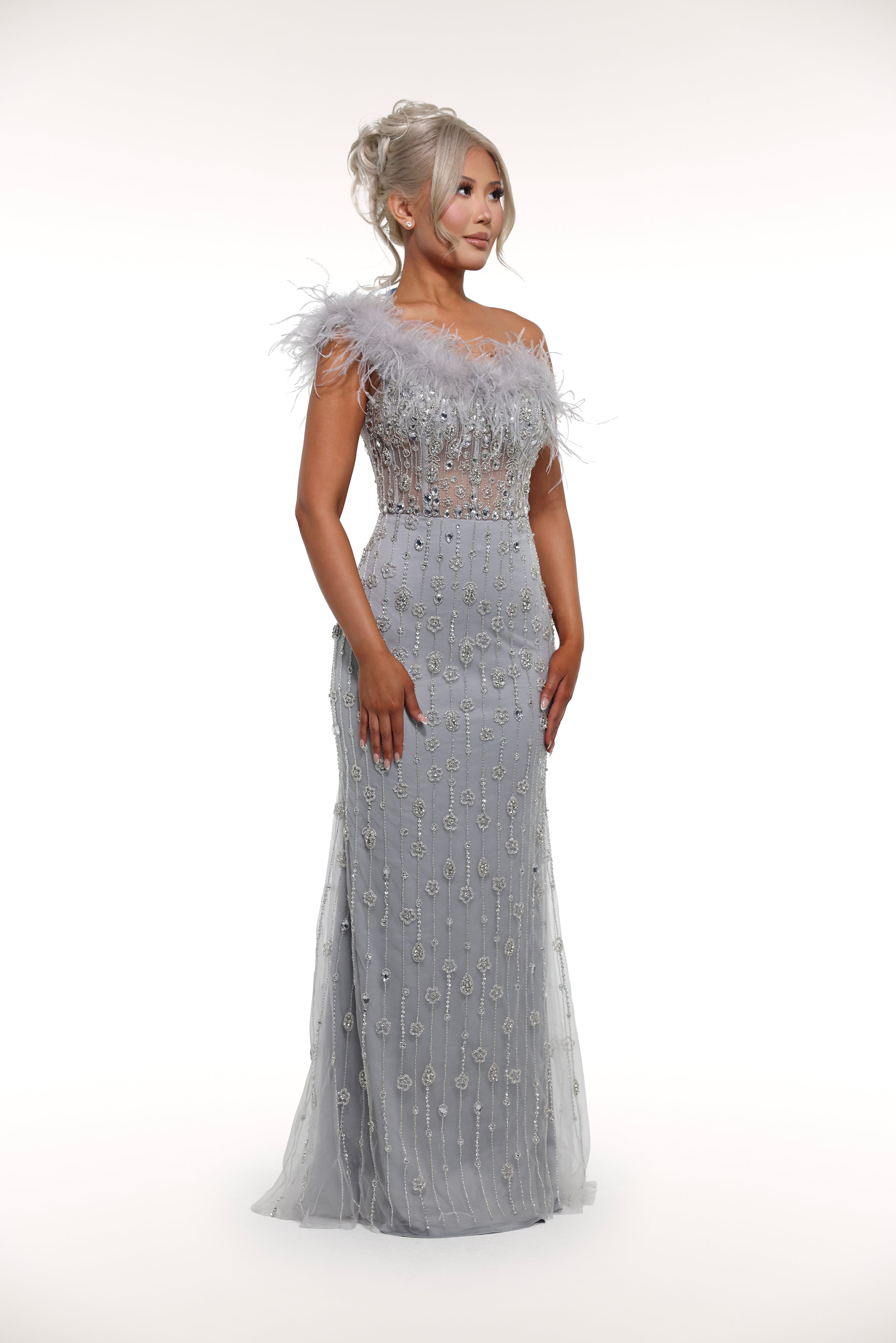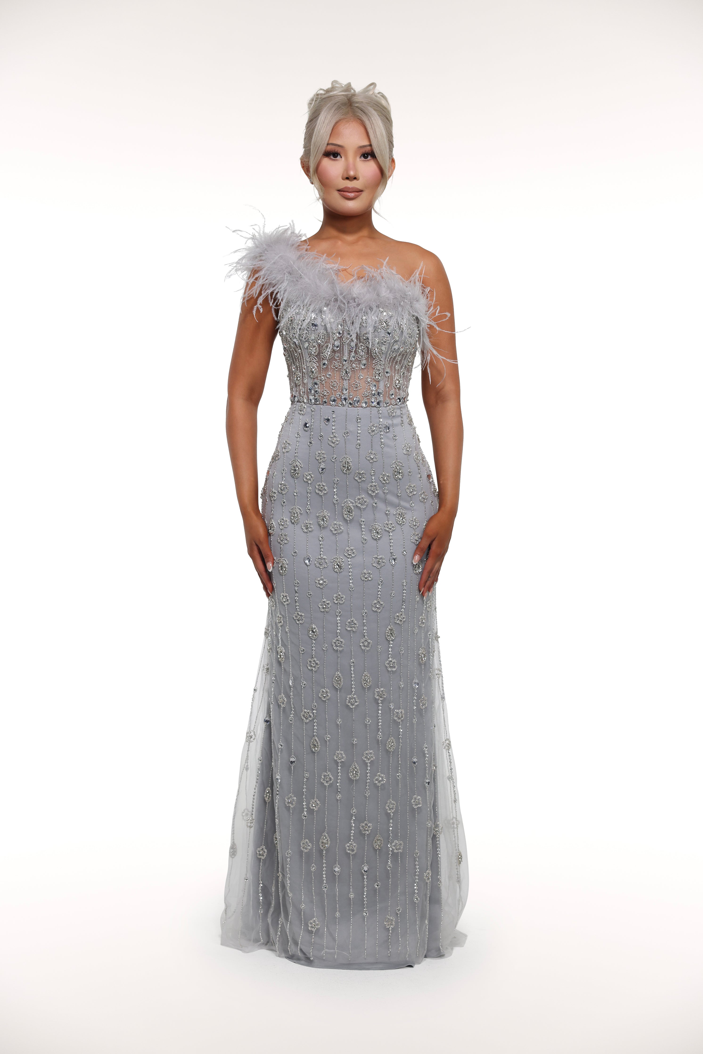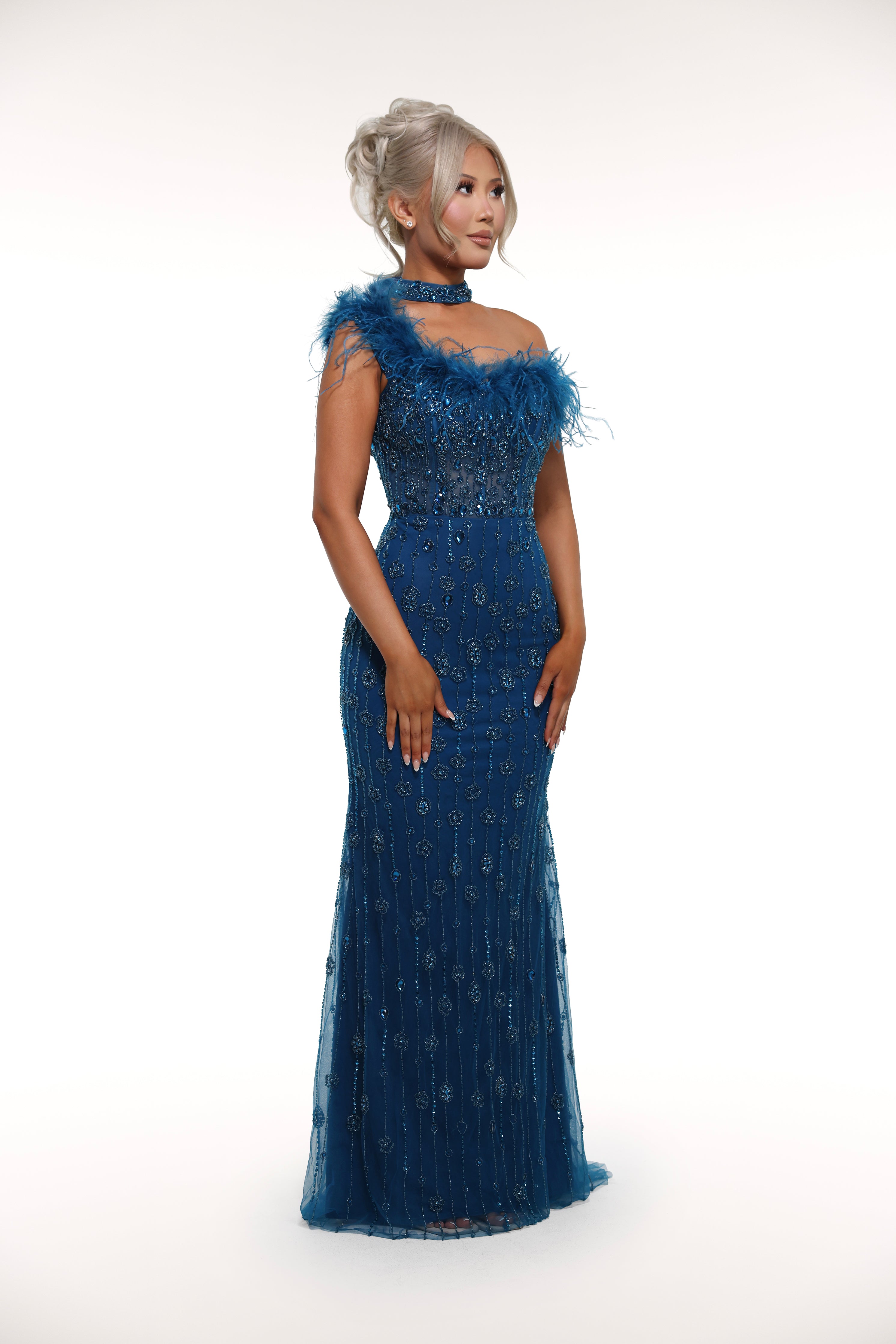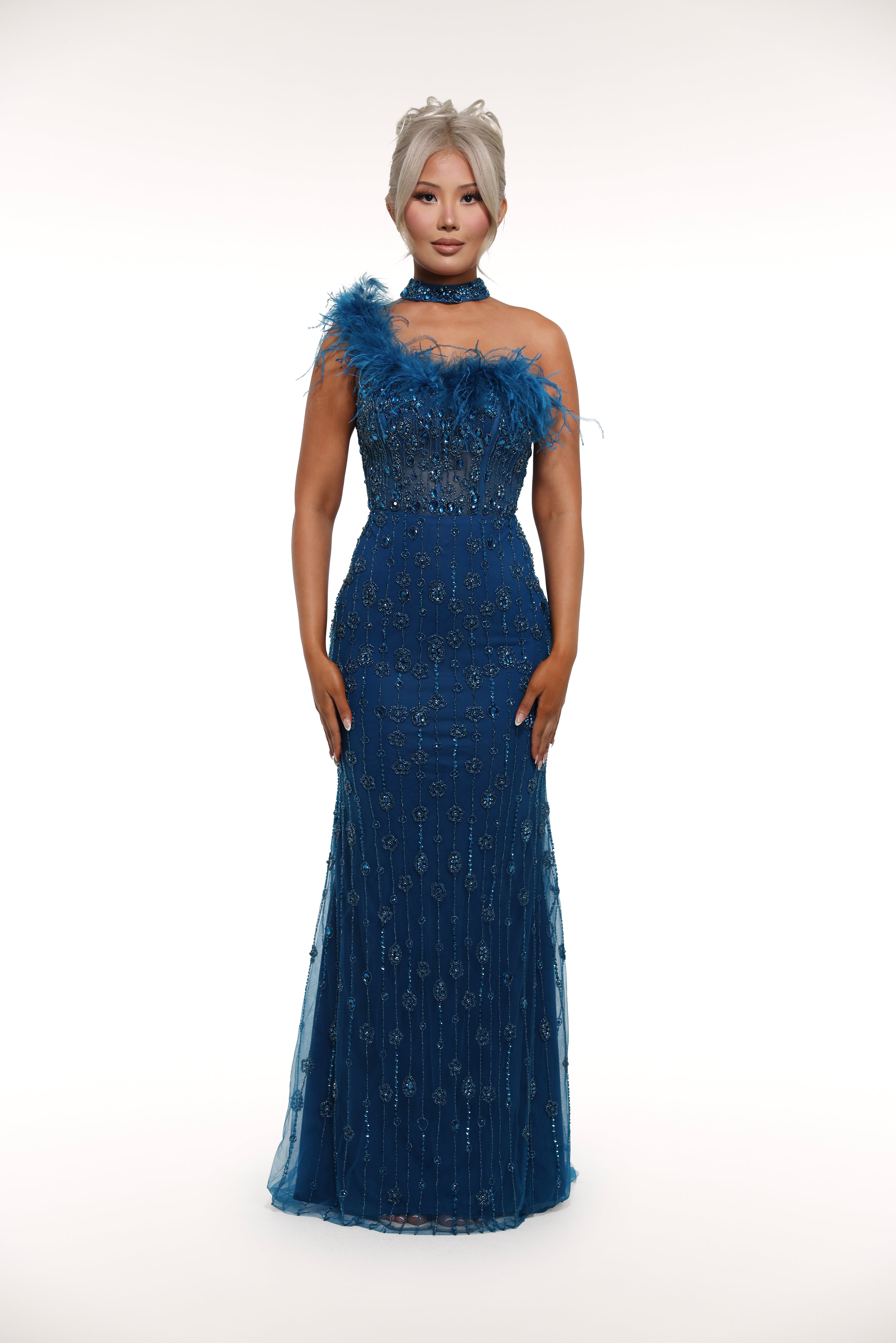 Step into the world of luxury with our 'Paris' gown. Featuring rhinestone embellished details, a mesh corset bust with feather lining, and a one off shoulder strap with a removable choker, this gown exudes elegance and sophistication. Make a statement at your next event with this stunning piece.