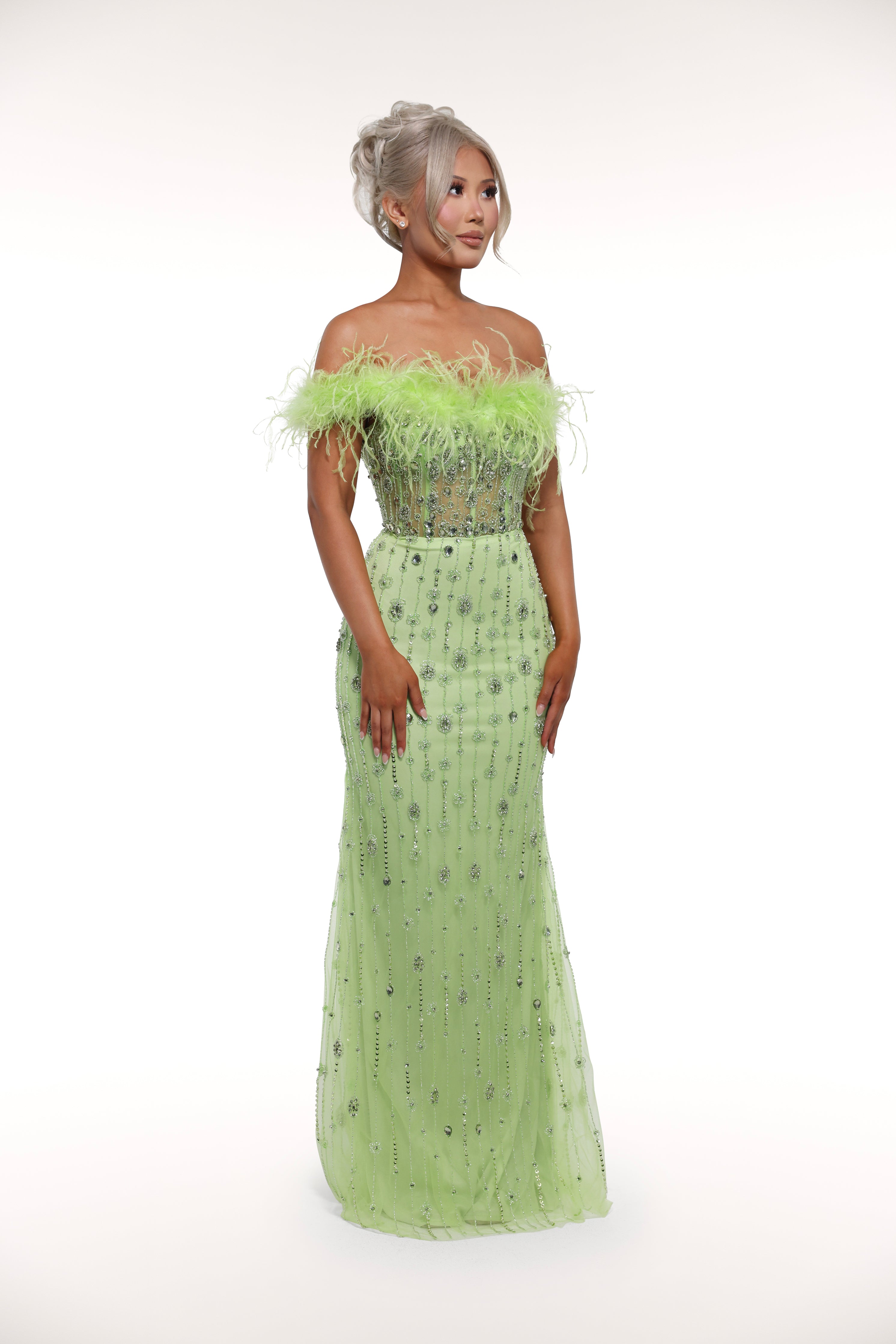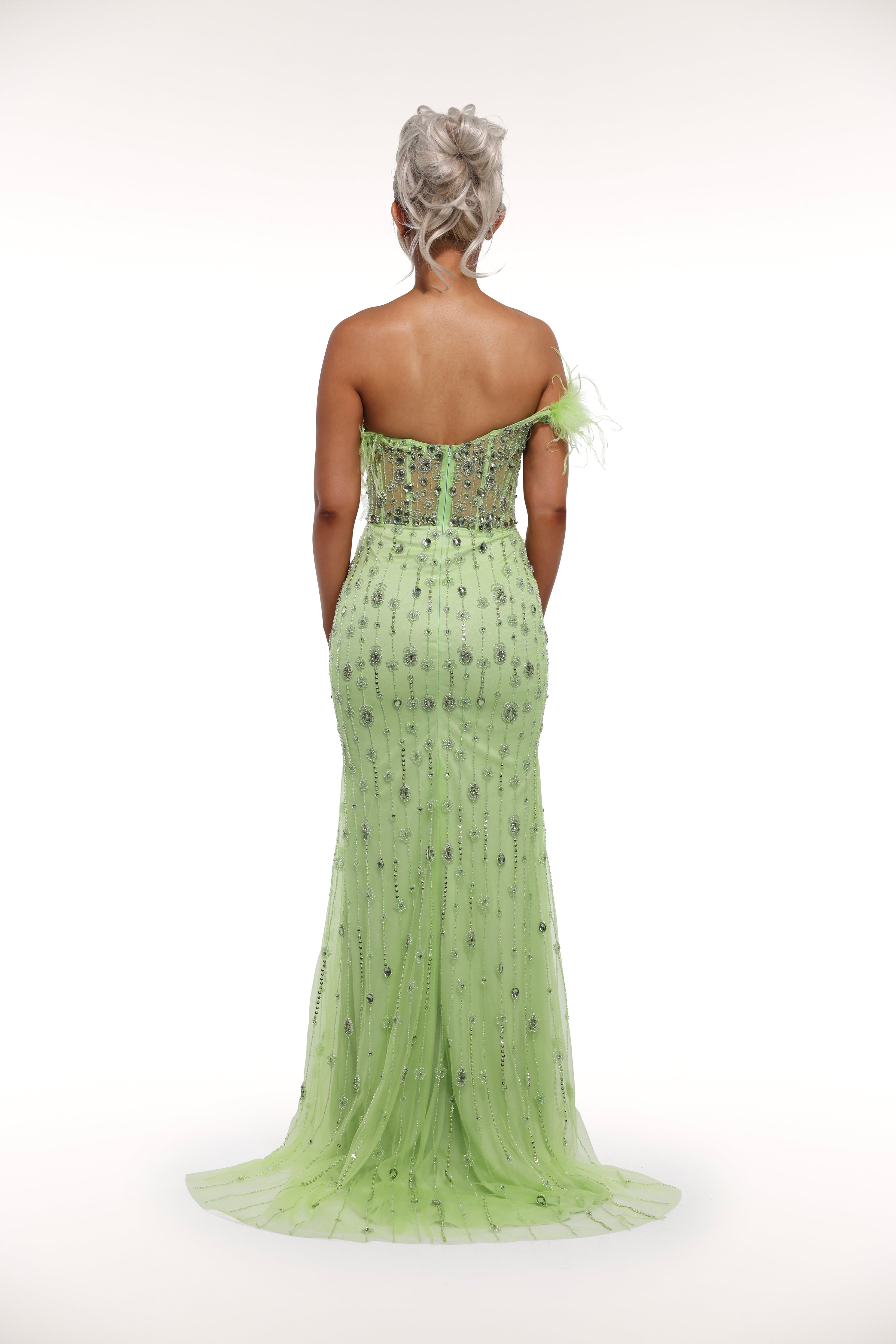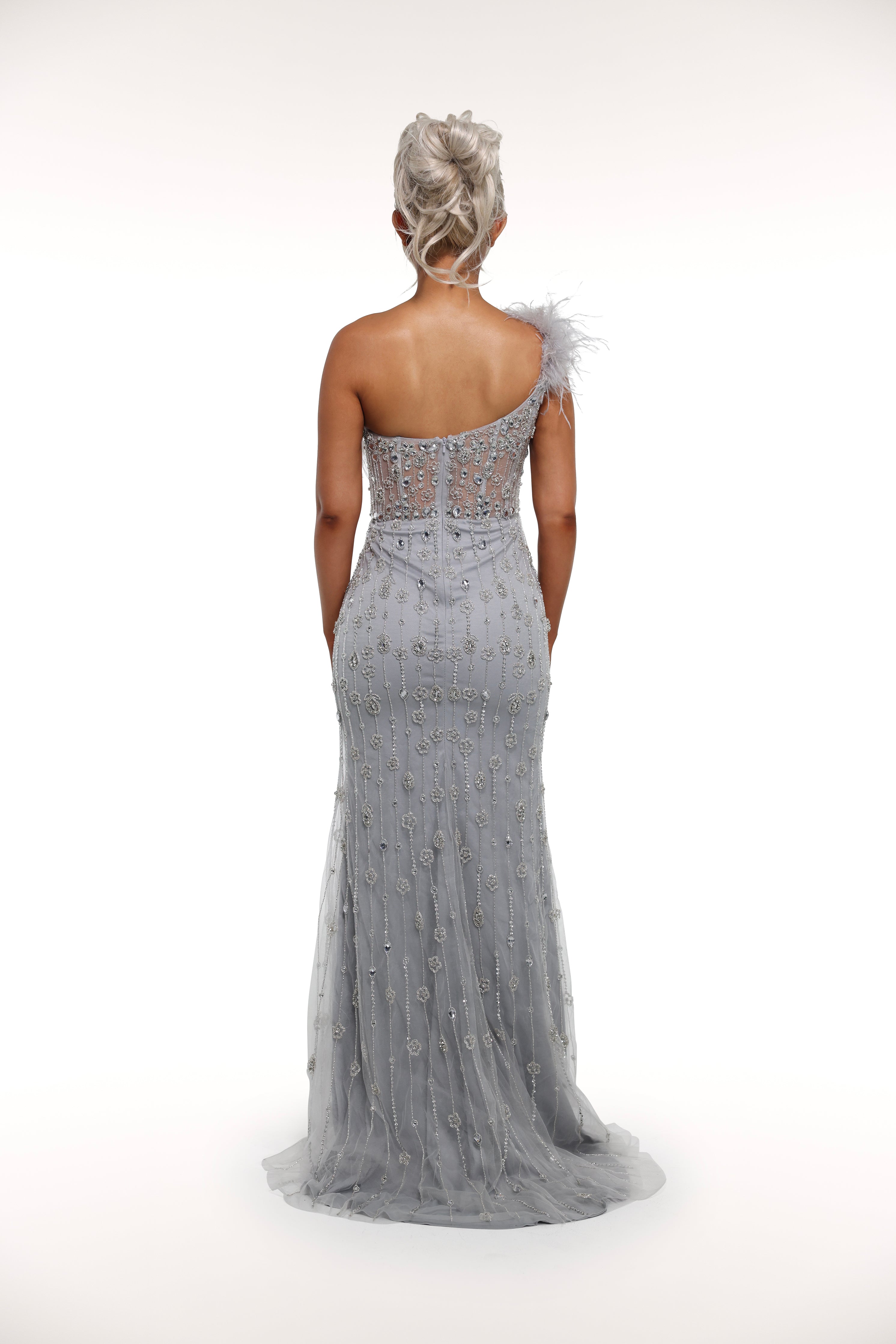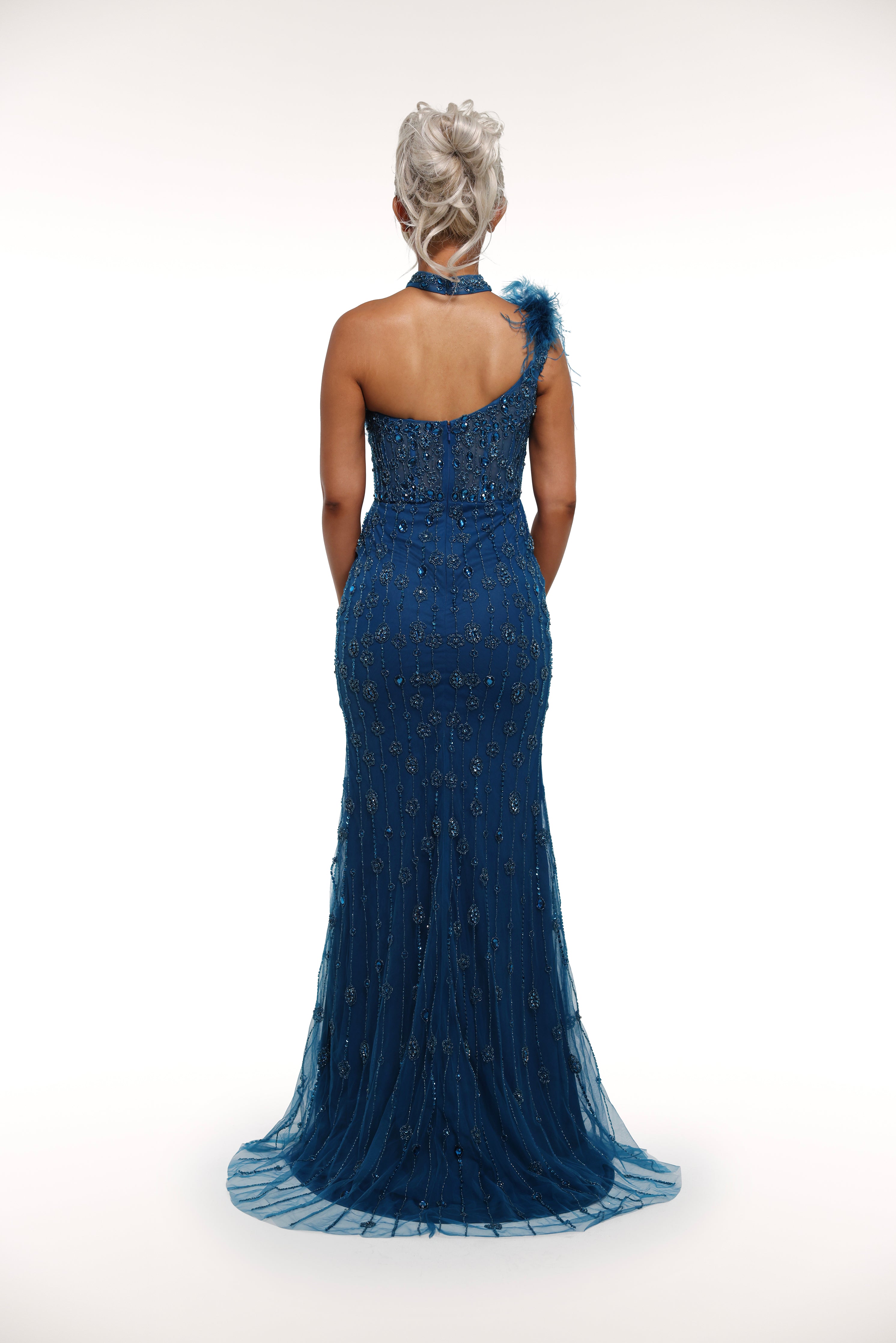 Step into the world of luxury with our 'Paris' gown. Featuring rhinestone embellished details, a mesh corset bust with feather lining, and a one off shoulder strap with a removable choker, this gown exudes elegance and sophistication. Make a statement at your next event with this stunning piece.