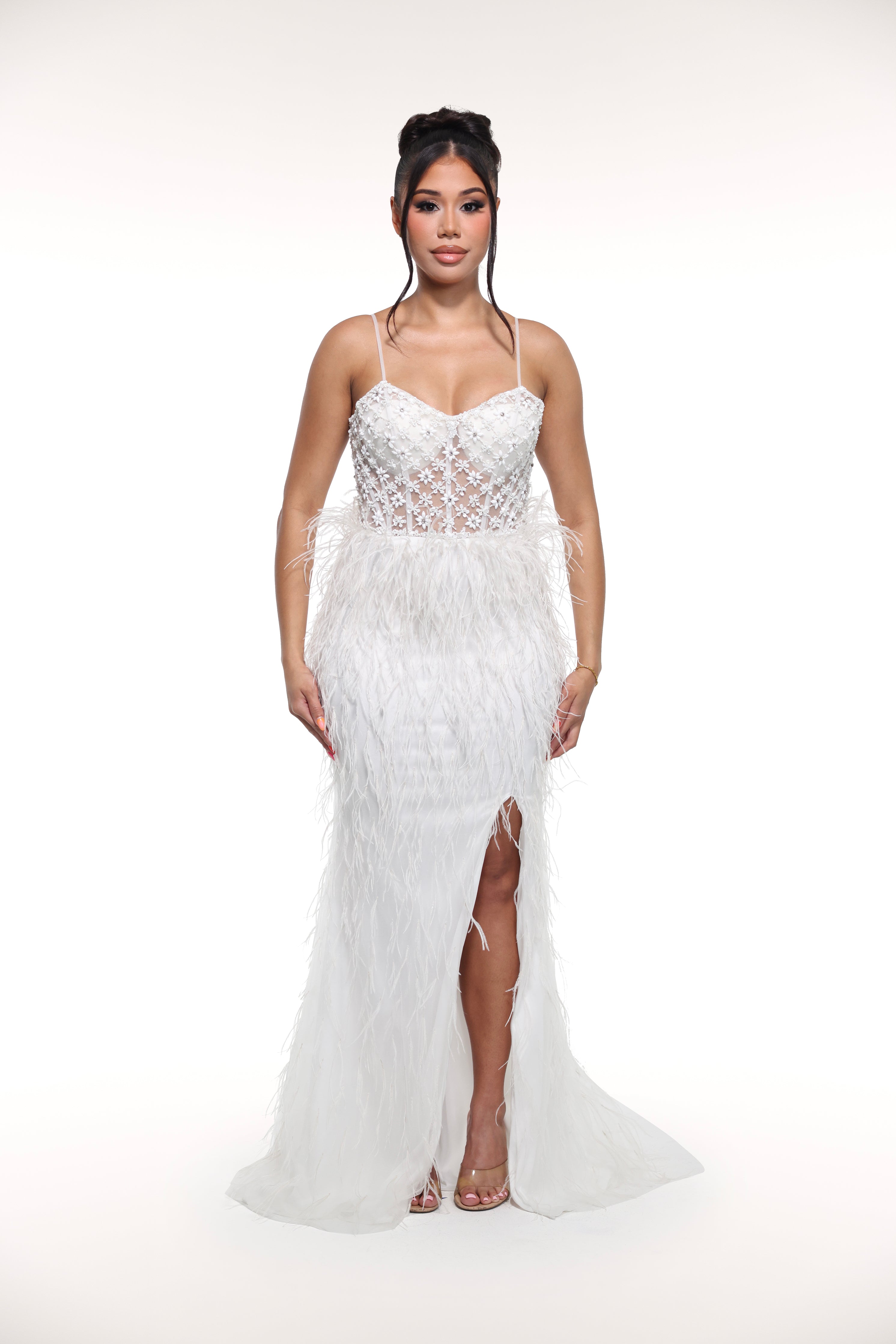 Steal the show at any event with the glamorous 'Tea Party' dress. The corset top is adorned with sparkling sequins, while the feather-covered skirt and left leg slit add a touch of elegance. The thin straps provide both comfort and support, making this the perfect choice for any party.