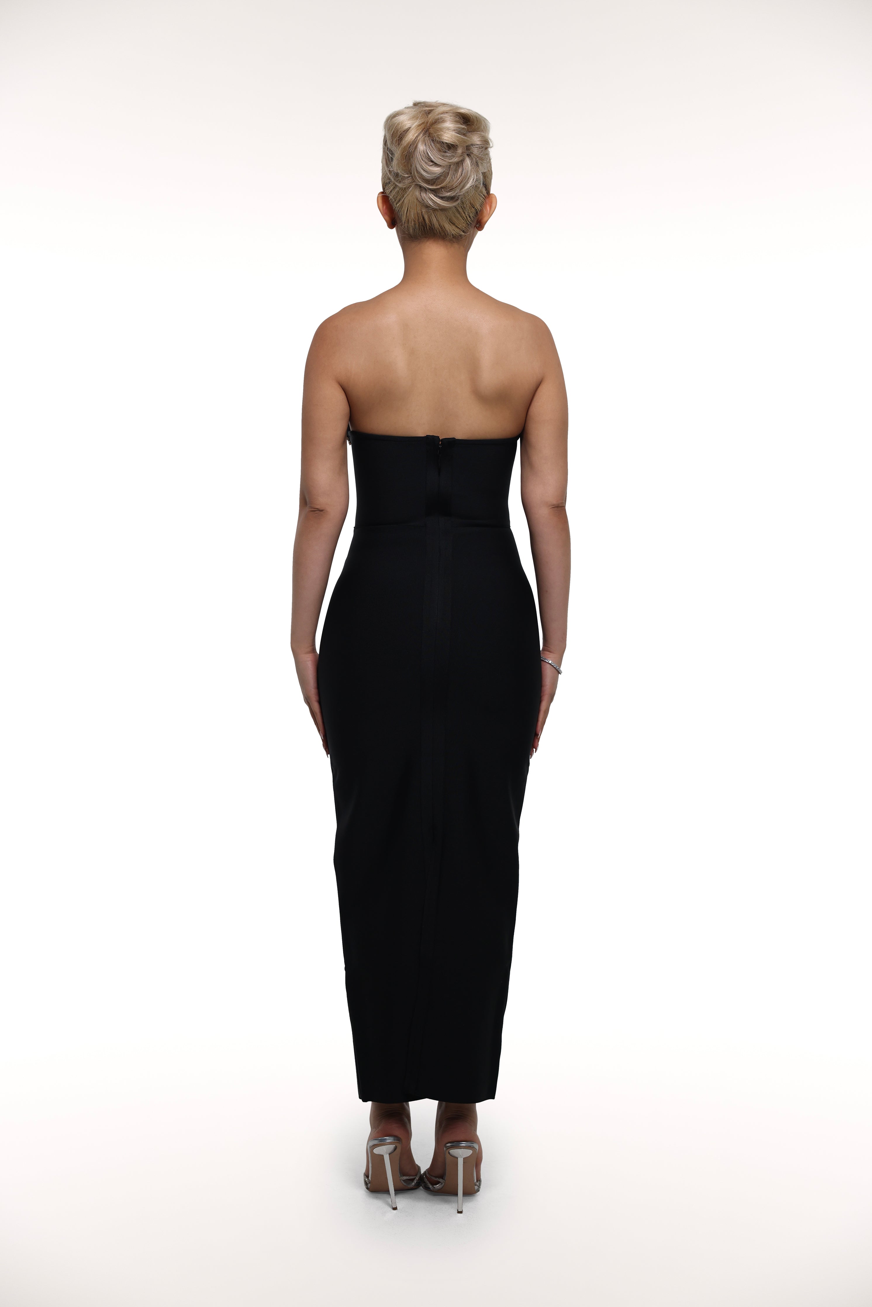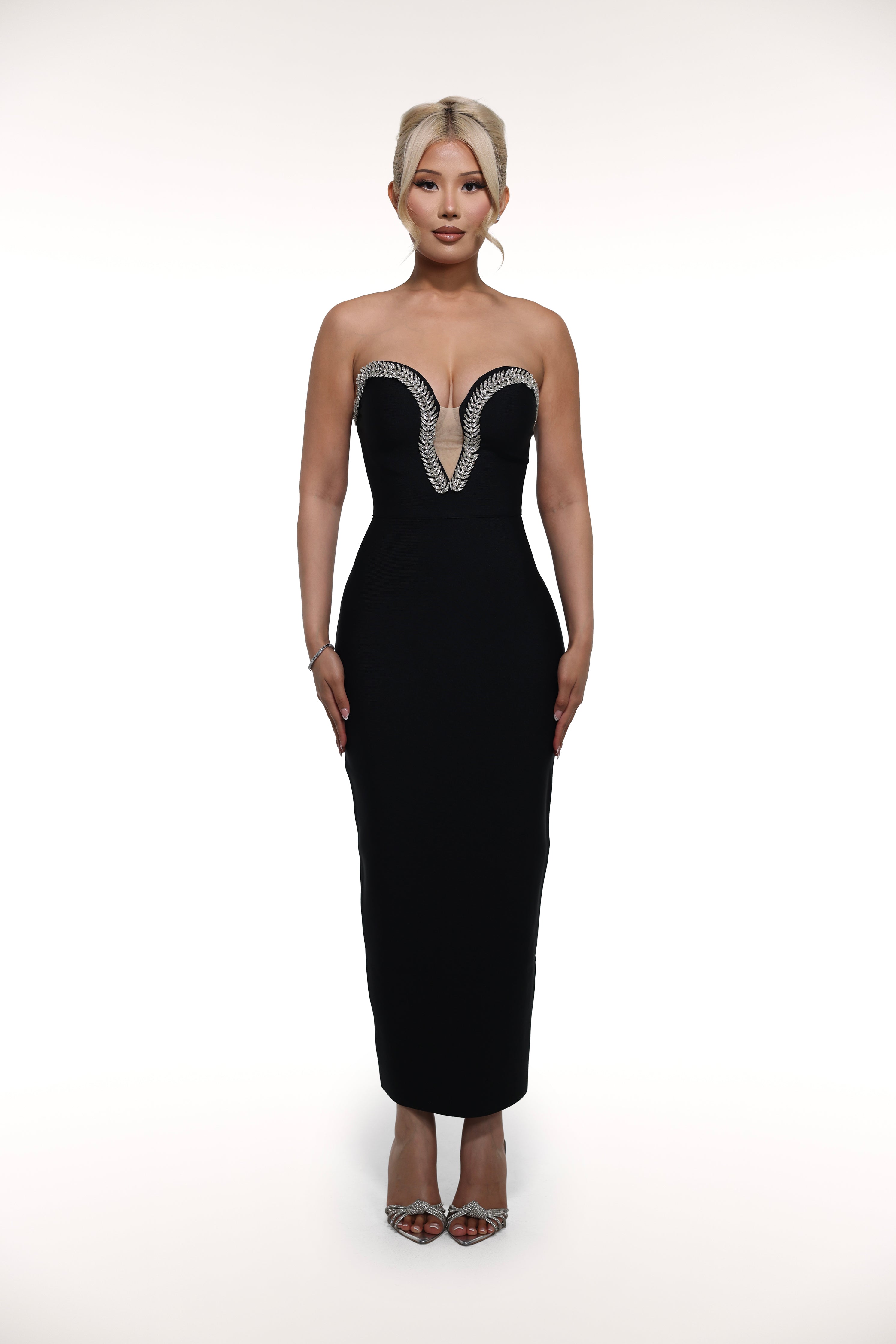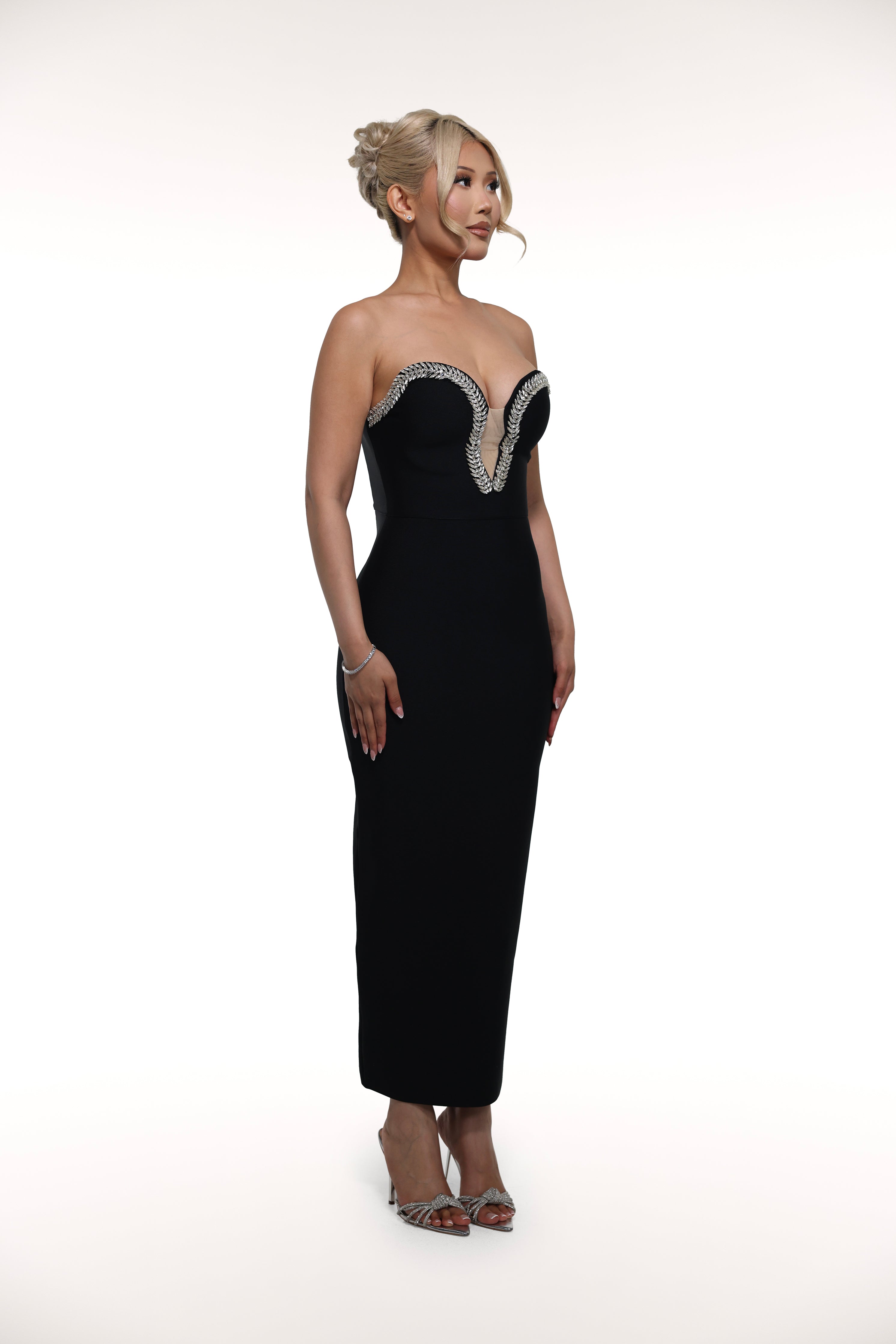 The 'Gem' dress is a stunning choice for any formal occasion. The strapless design and crystal outlining around the neckline add a touch of sophistication, while the slit in the middle back adds a subtle hint of allure.