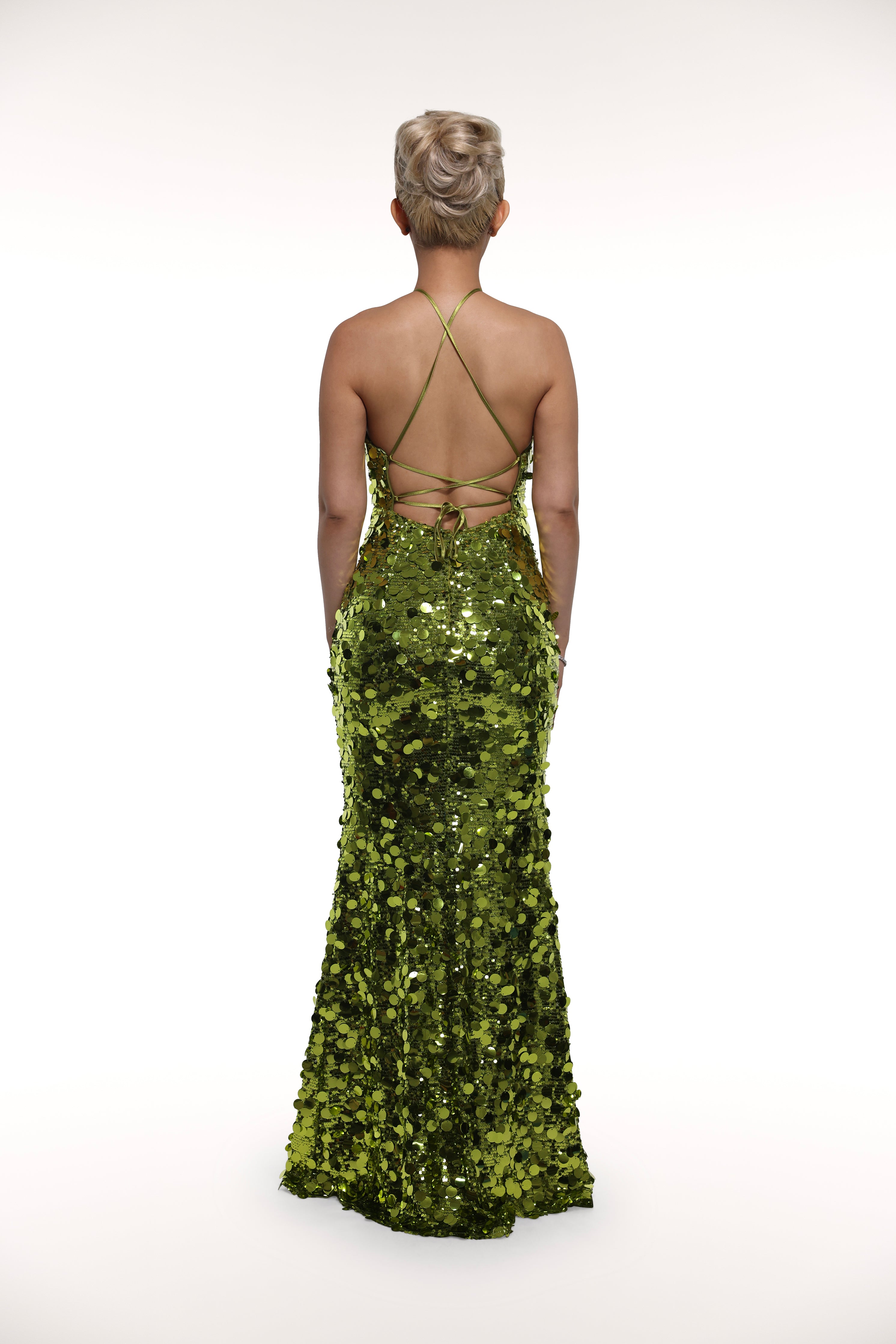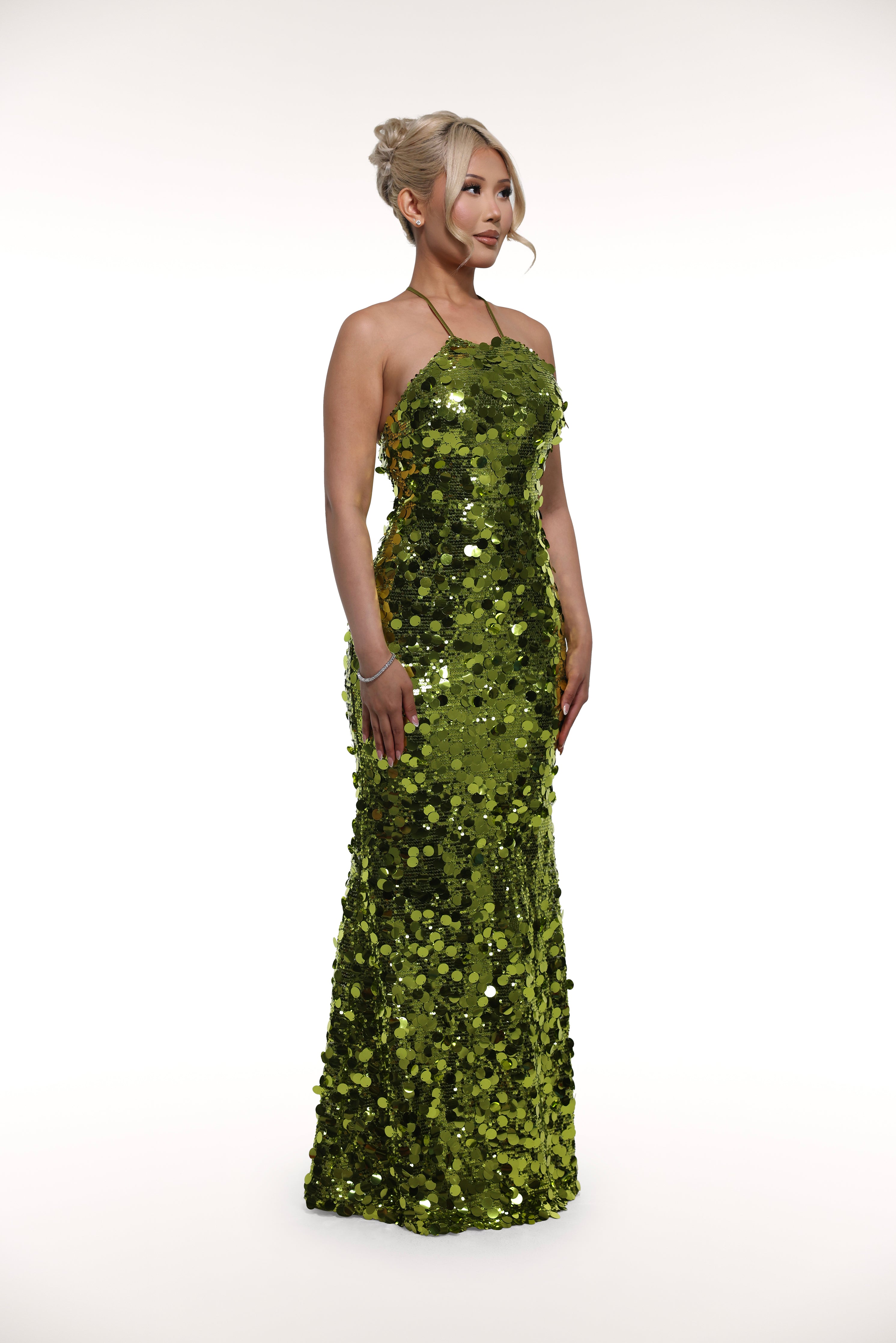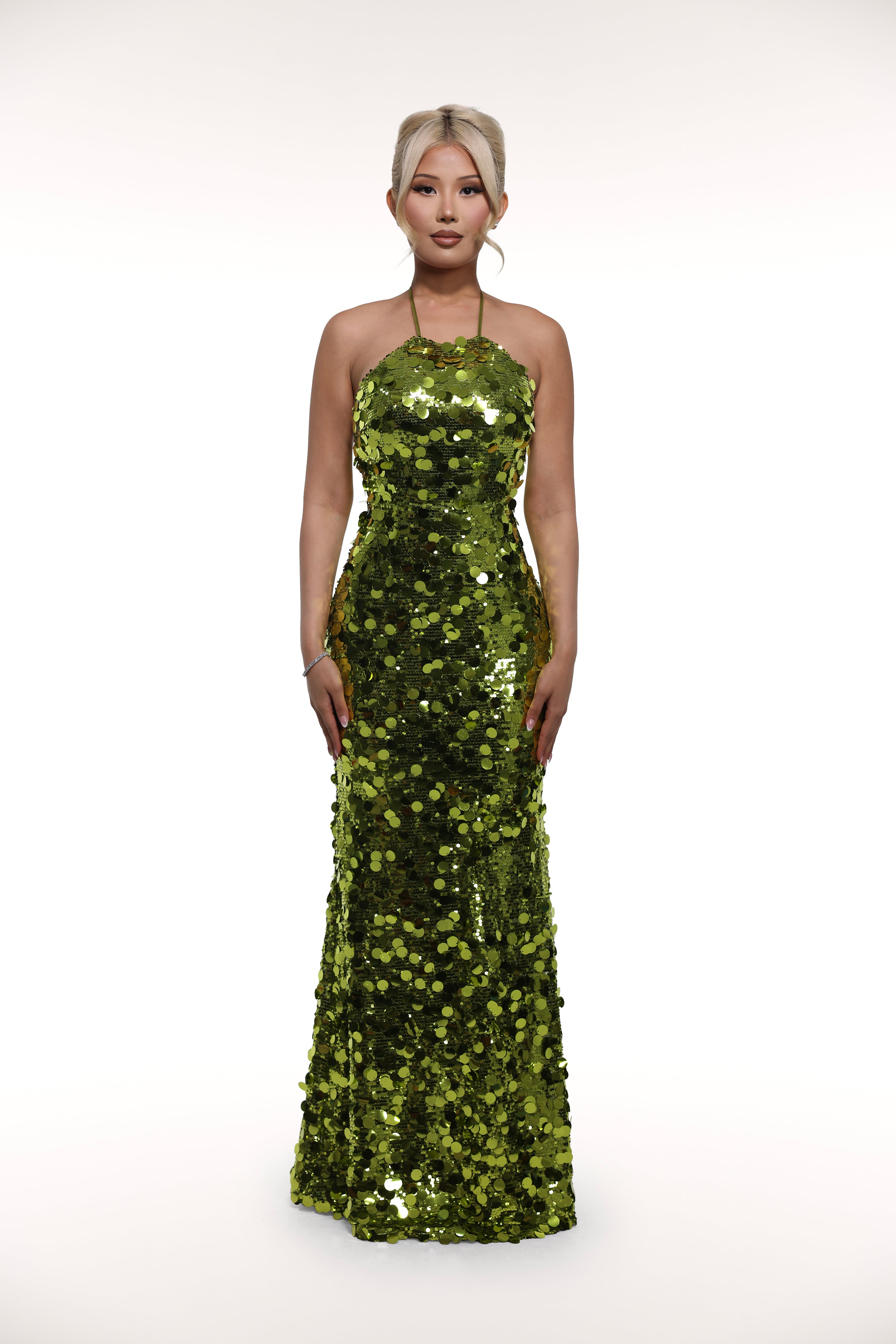 Our 'Elinor' dress is made from a stunning olive layered sequin fabric that catches the light with every movement. This long gown has a low, open back with a halter neckline in the front. The string tie-back adds that much more character and allure.