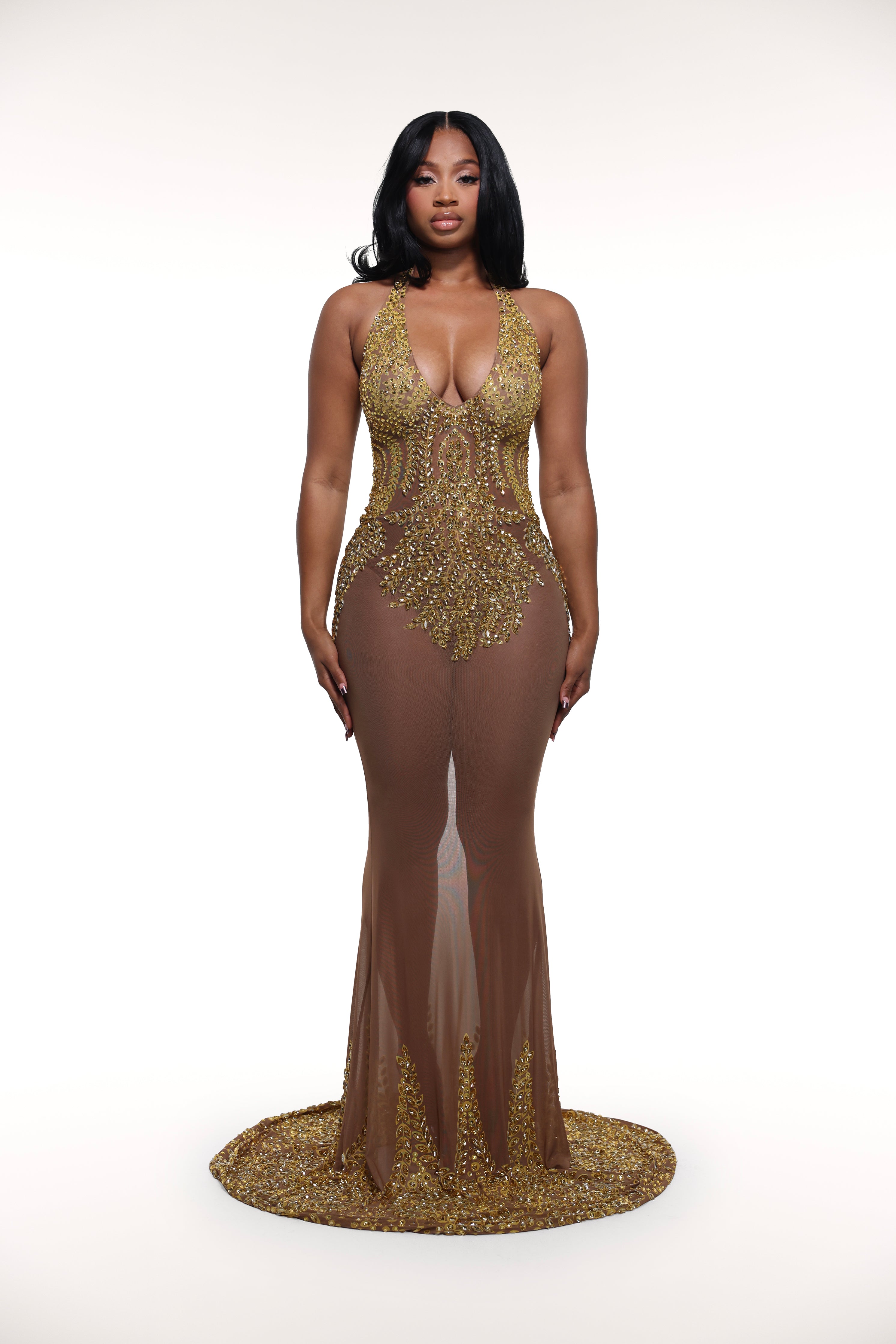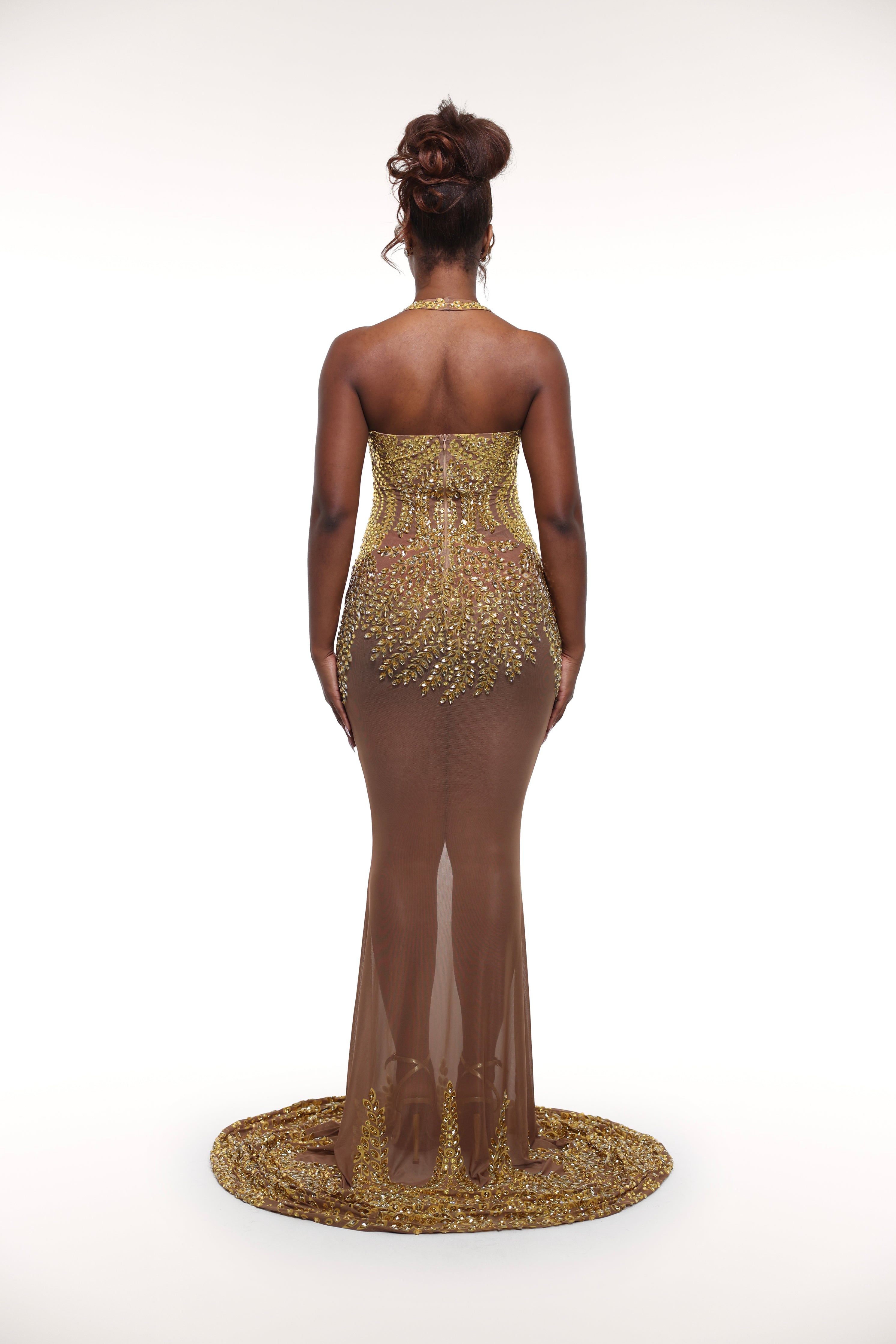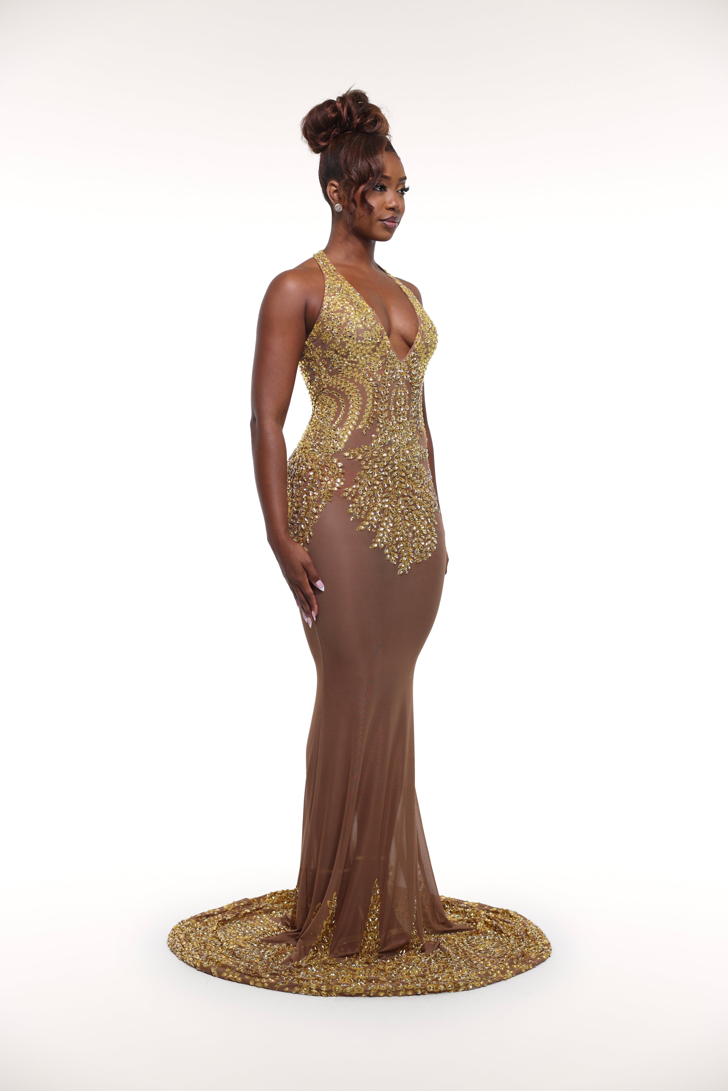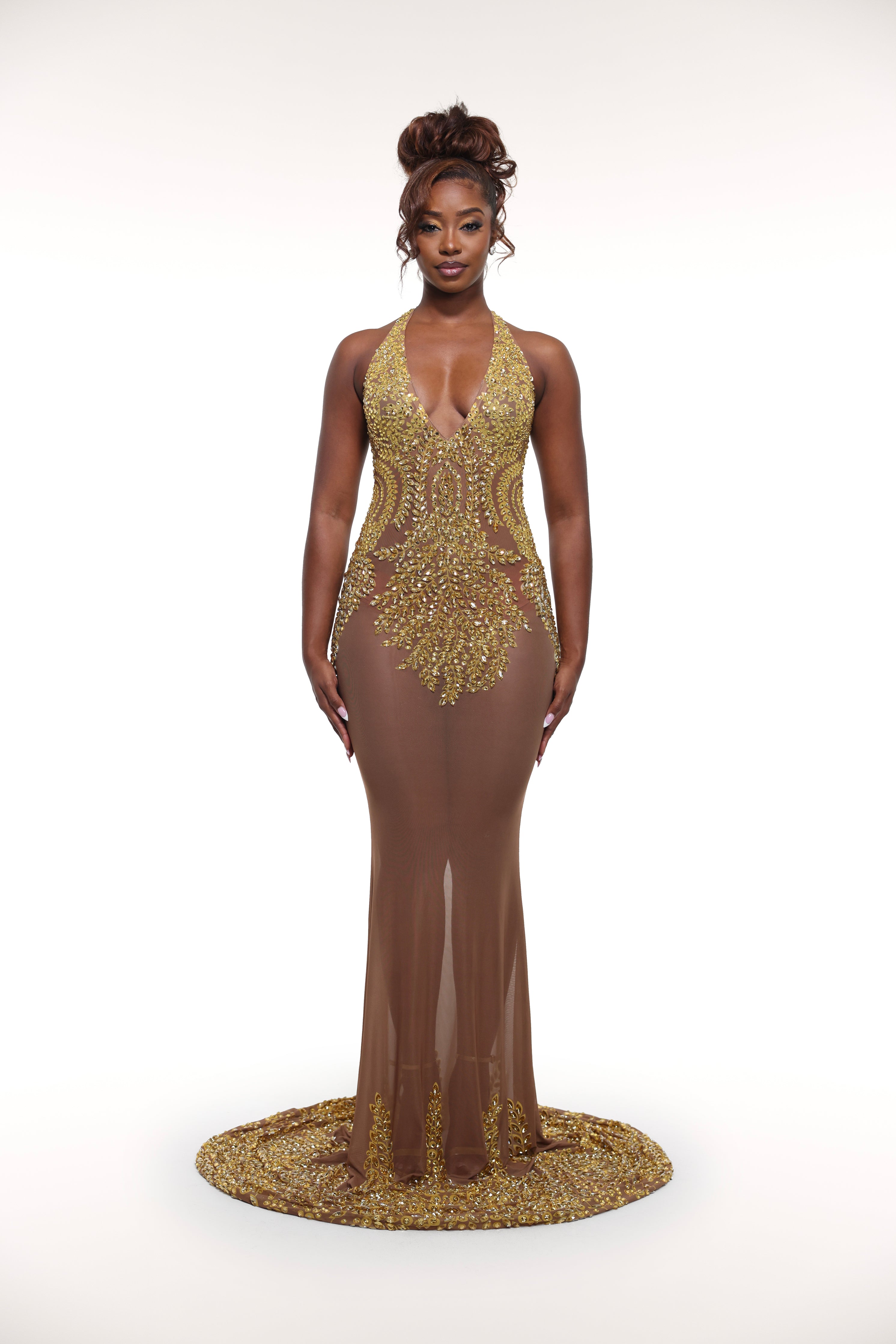 'Regalia' is a truly one-of-a-kind gown both in looks and style. Halter top neckline that emphasizes the plunging neckline for a sexy look. This long dress is made of a stretchy mesh fabric with a slit in the back for easy movement and a figure-hugging outline and matching rhinestone embellishments covering the whole piece.