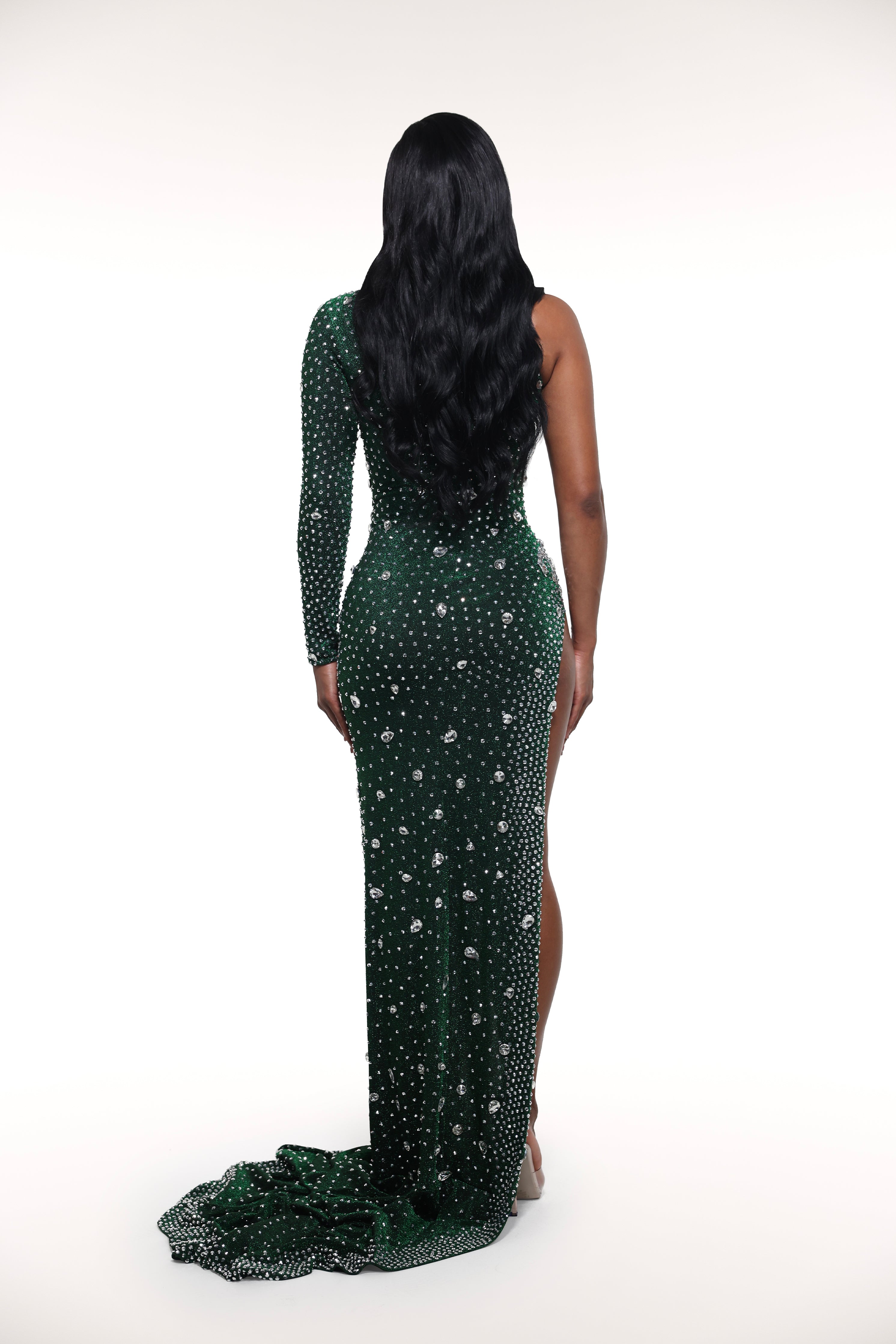 Turn heads in the 'Pink Princess ' gown, featuring a playful one-sleeve design and a high neck crafted from delicate pink mesh. This stunning dress dazzles with silver gems scattered all over, adding sparkle to every move. The extra-long train flows gracefully behind you, making every step feel like a royal entrance. Perfect for those who love a mix of elegance and fun flair!