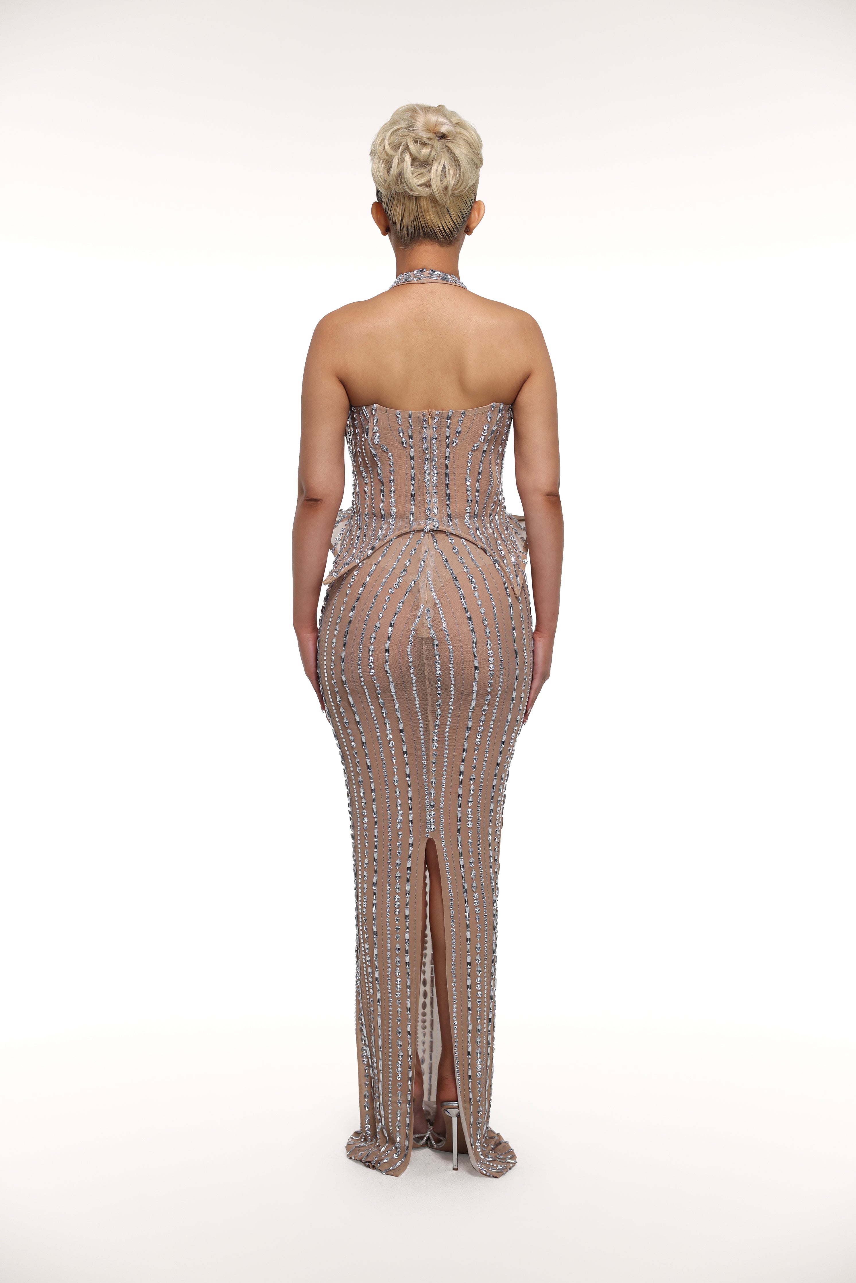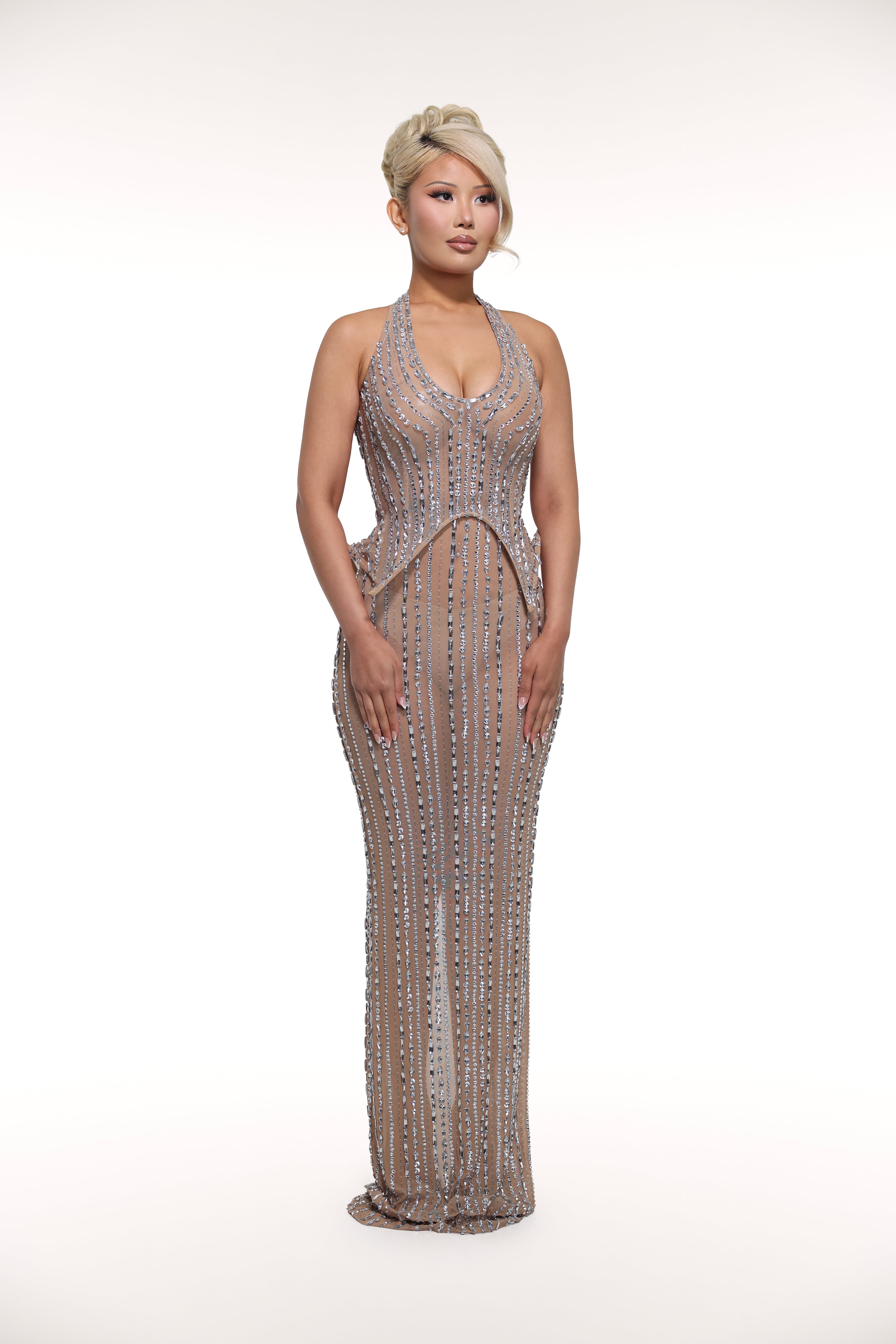 'Domunique' is a truly one-of-a-kind gown both in looks and style. Halter top neckline that emphasizes the plunging neckline for a sexy look with an intricate detail for the hips. This long dress is made of a stretchy mesh fabric with a slit in the back for easy movement and a figure-hugging outline and matching rhinestone embellishments covering the whole piece.