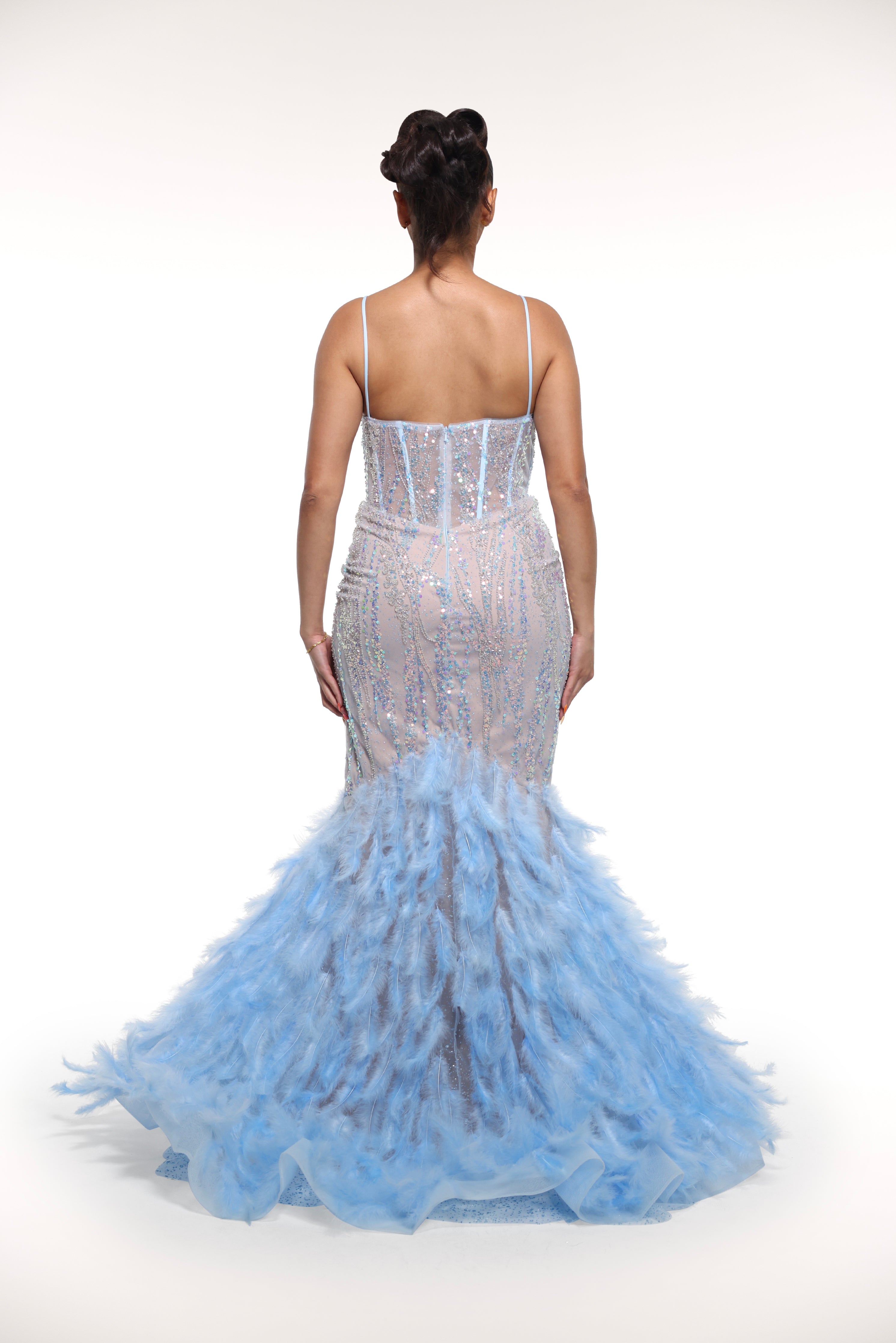 Indulge in the sweetness of our ‘Cotton Candy’ dress. This light blue gown features a stunning sequin pattern and delicate feathers adorning the skirt, making it a luxurious and exclusive piece. Perfect for a special occasion, this dress will make you feel like the star of the evening.