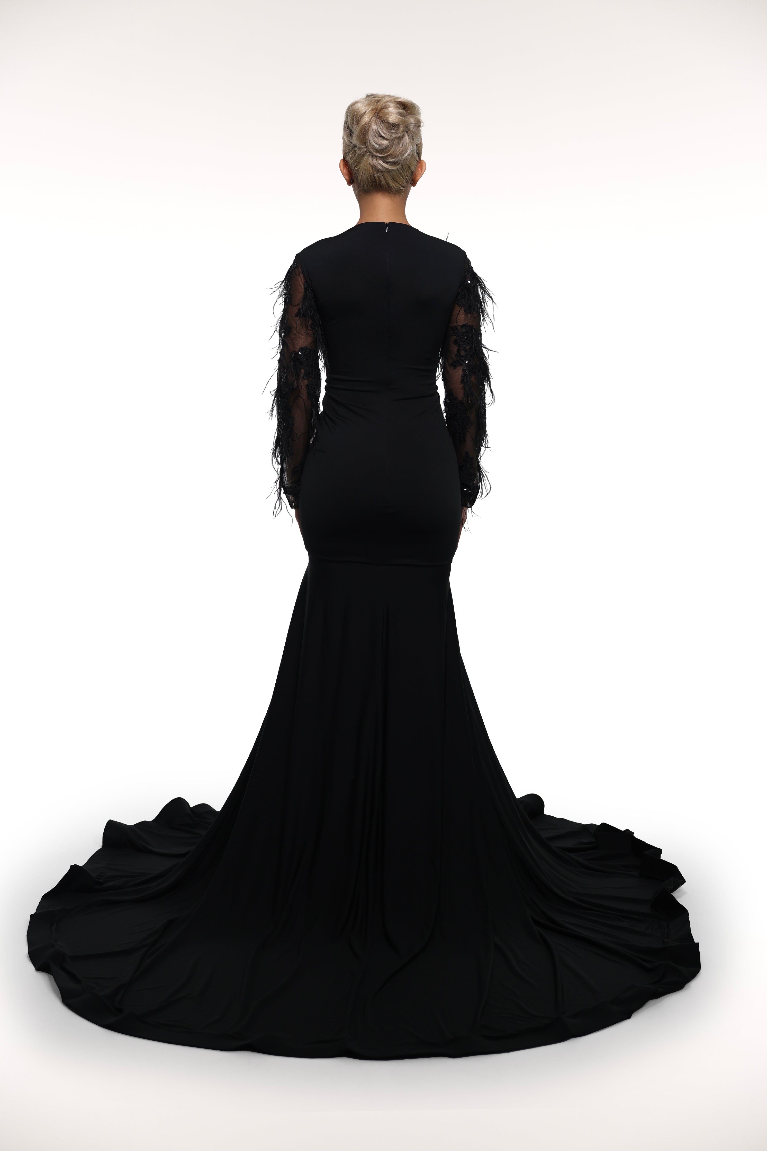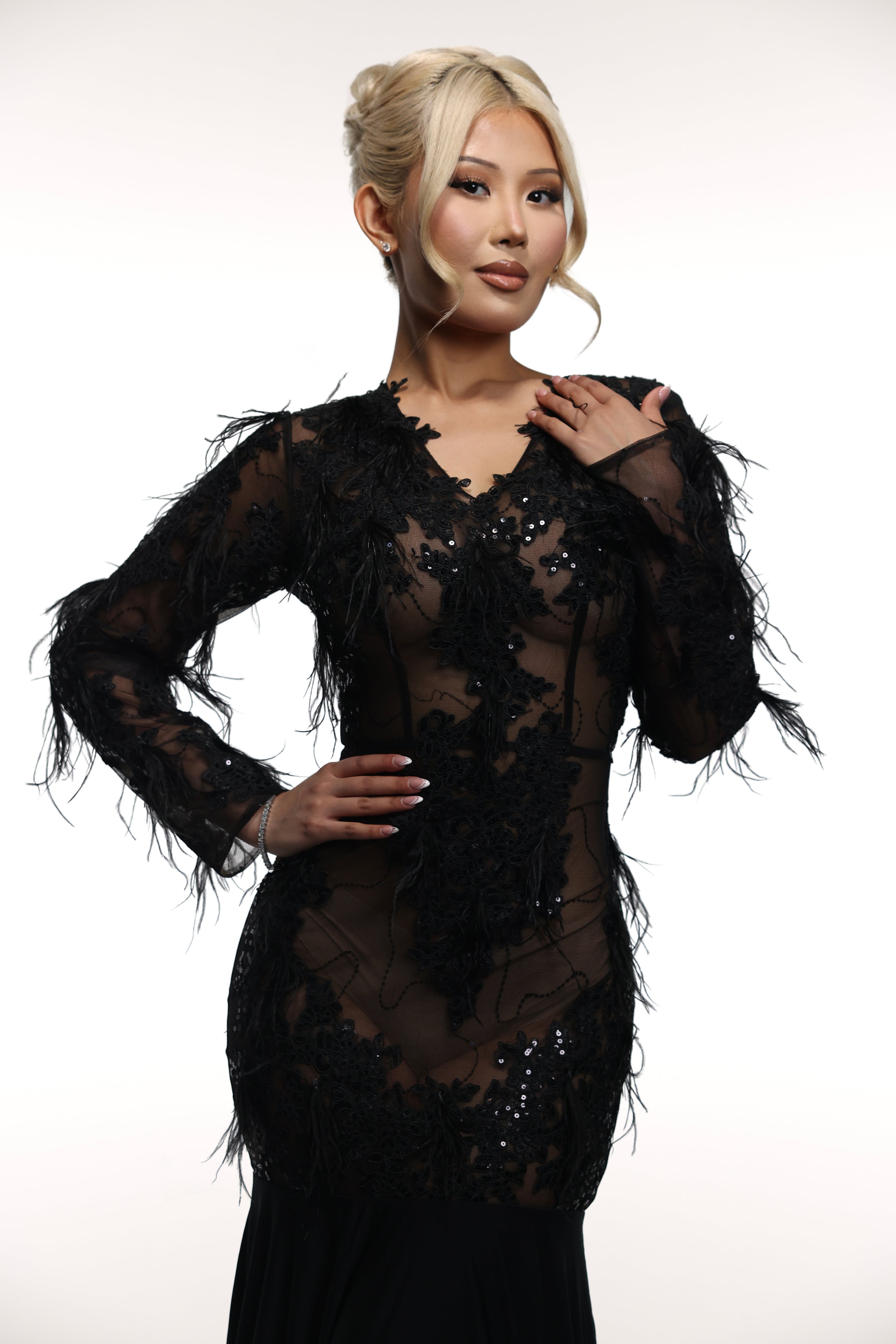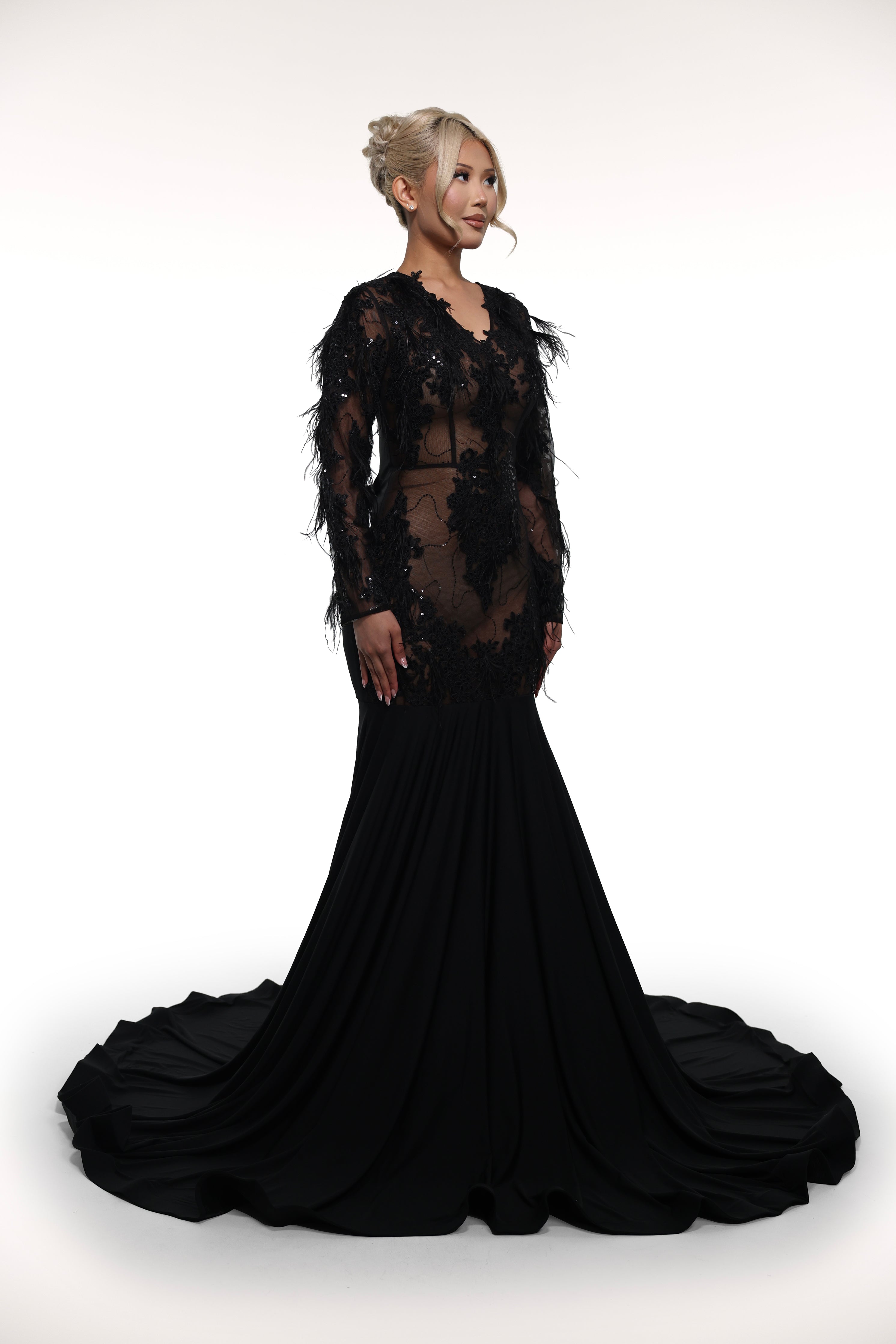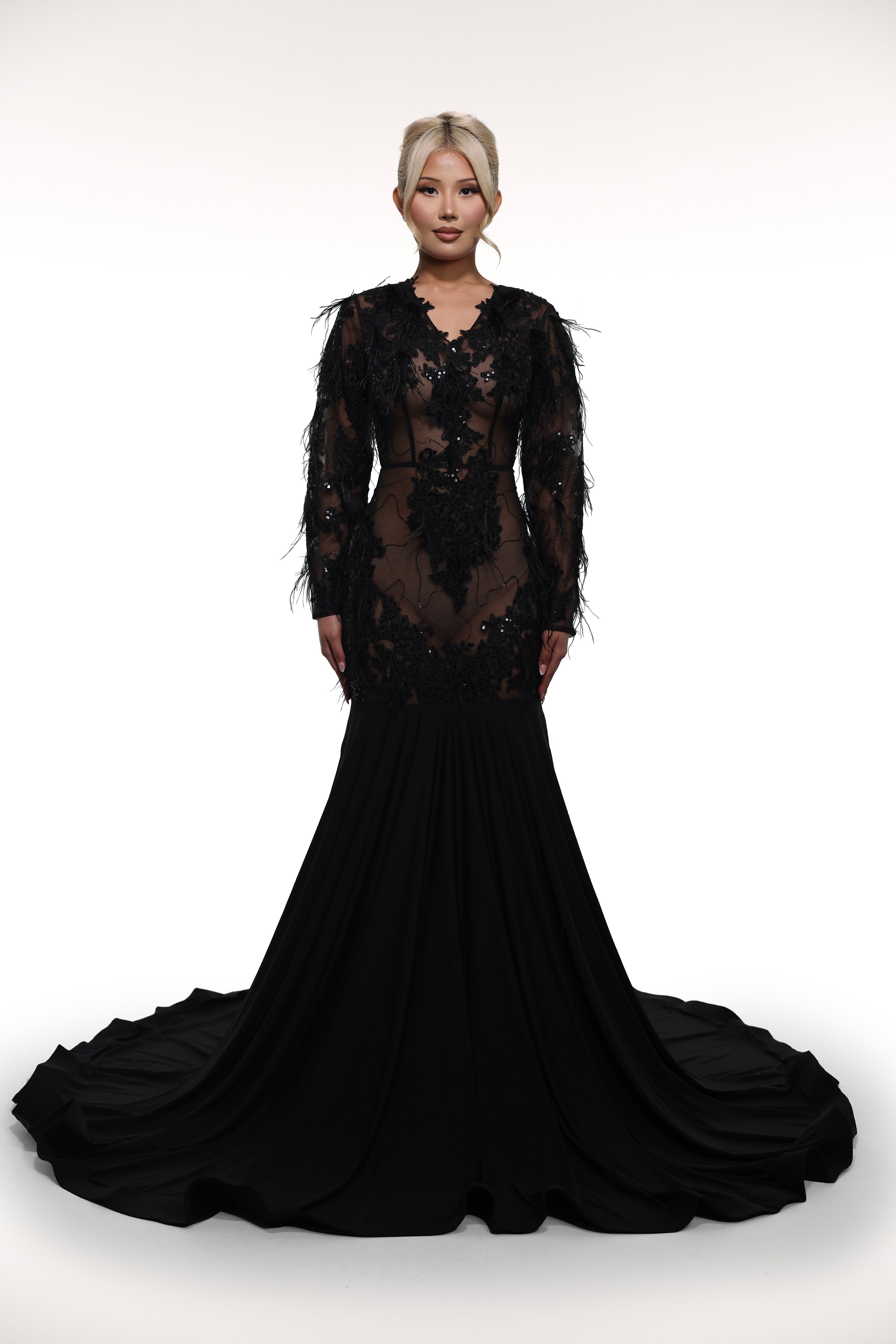 Step into the spotlight with the 'Aya Evening Gown', a playful blend of elegance and flair. This long-sleeve mesh dress features delicate lace detailing that adds a touch of romance, while the sleek skirt with a dramatic train brings movement and drama to every step.