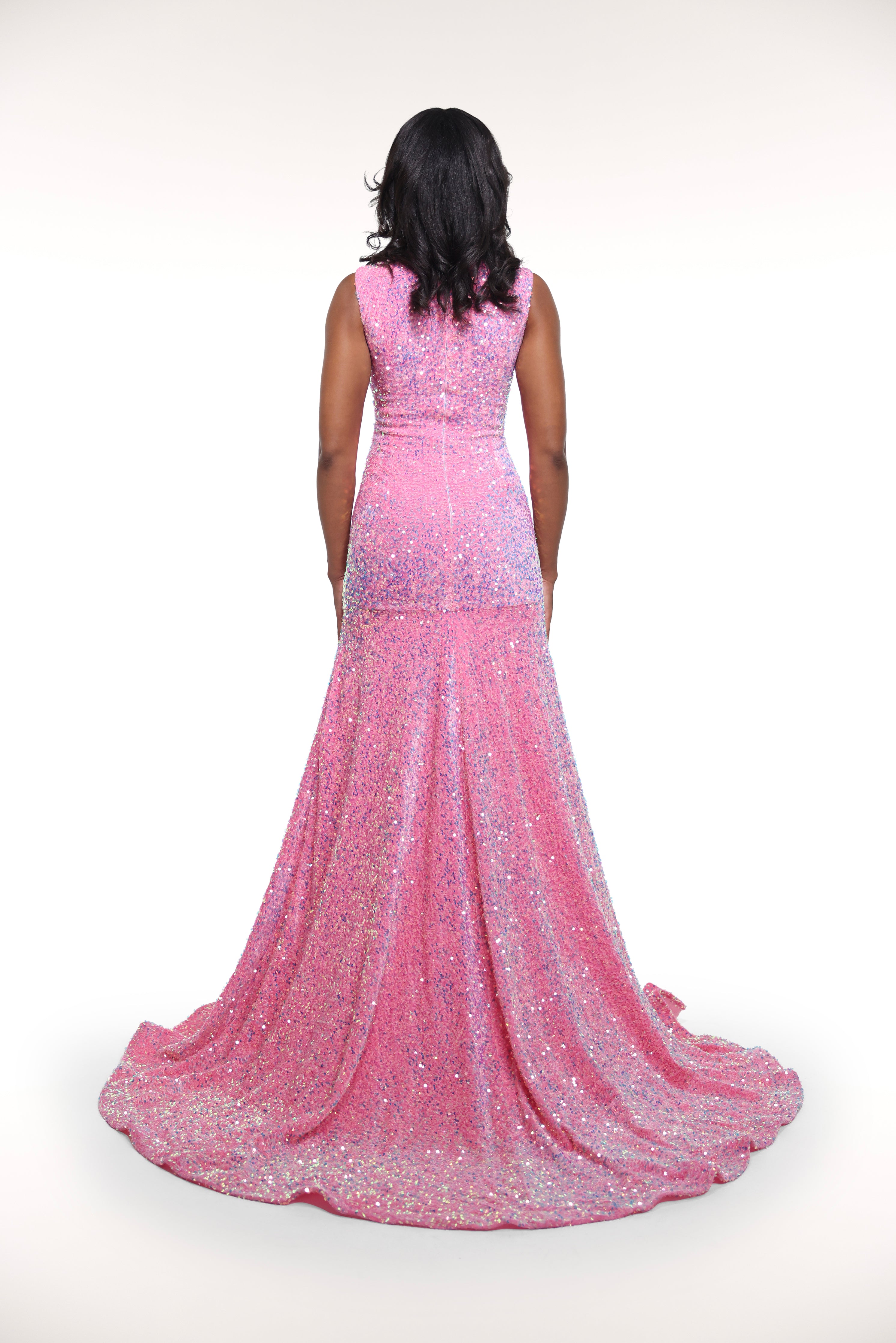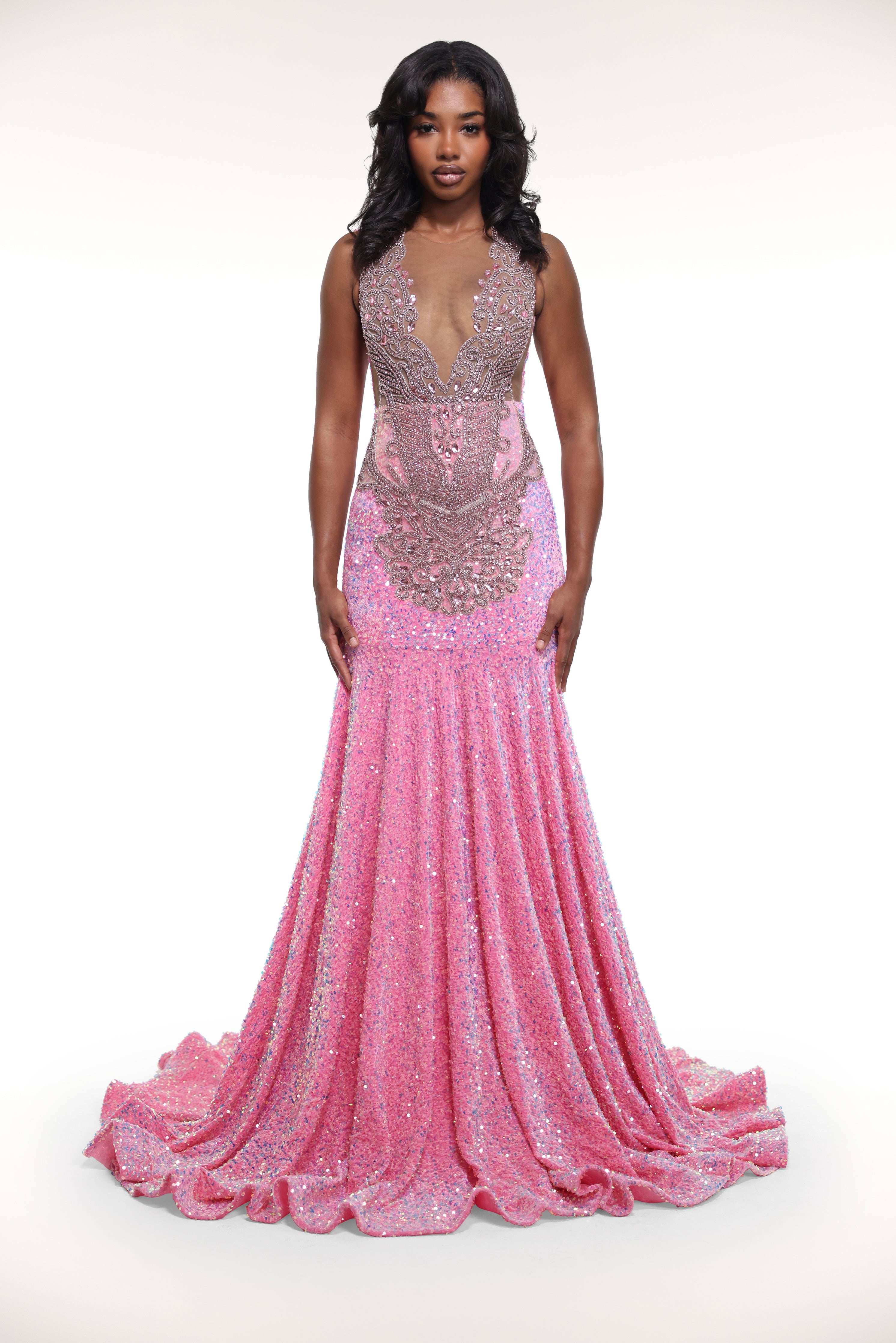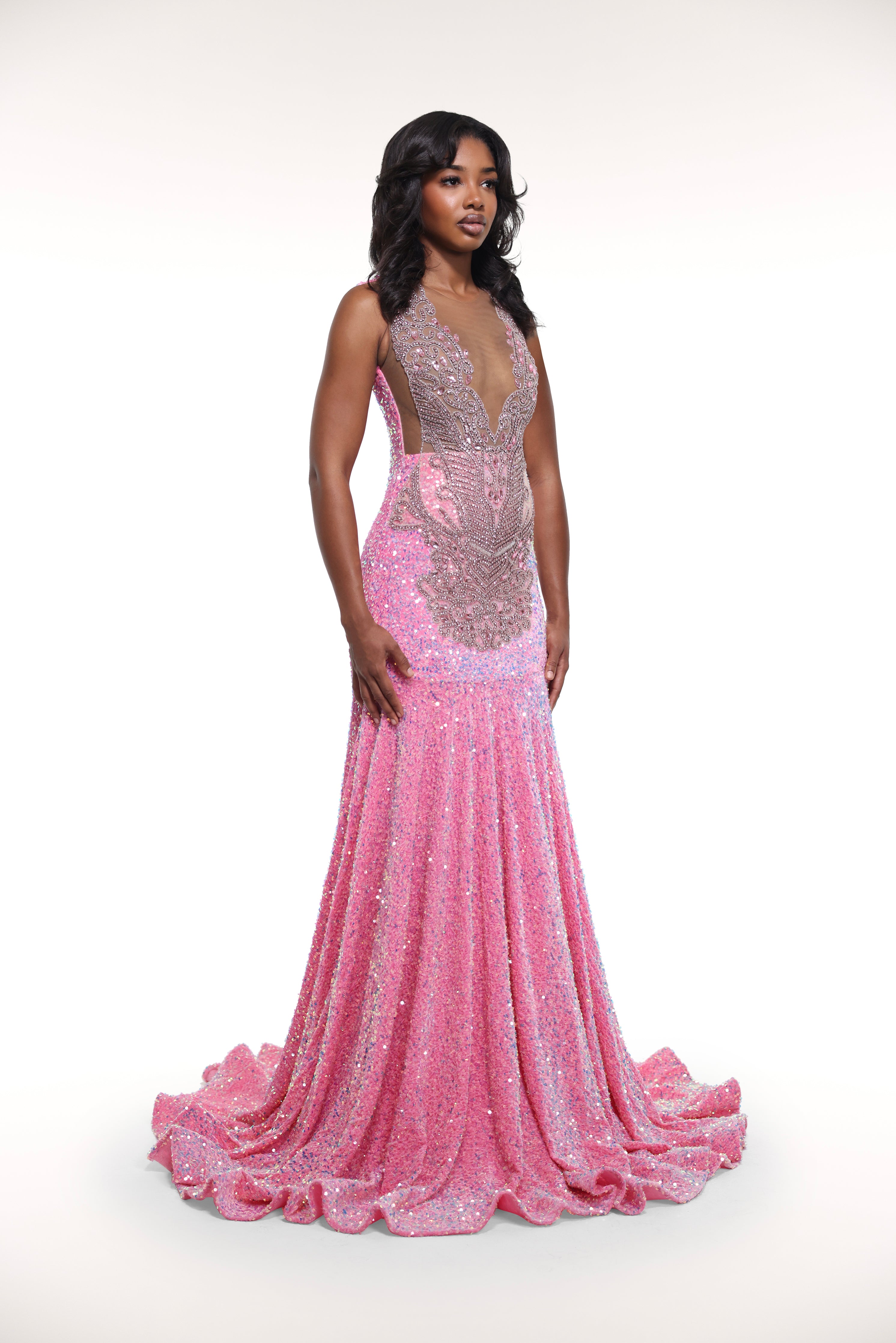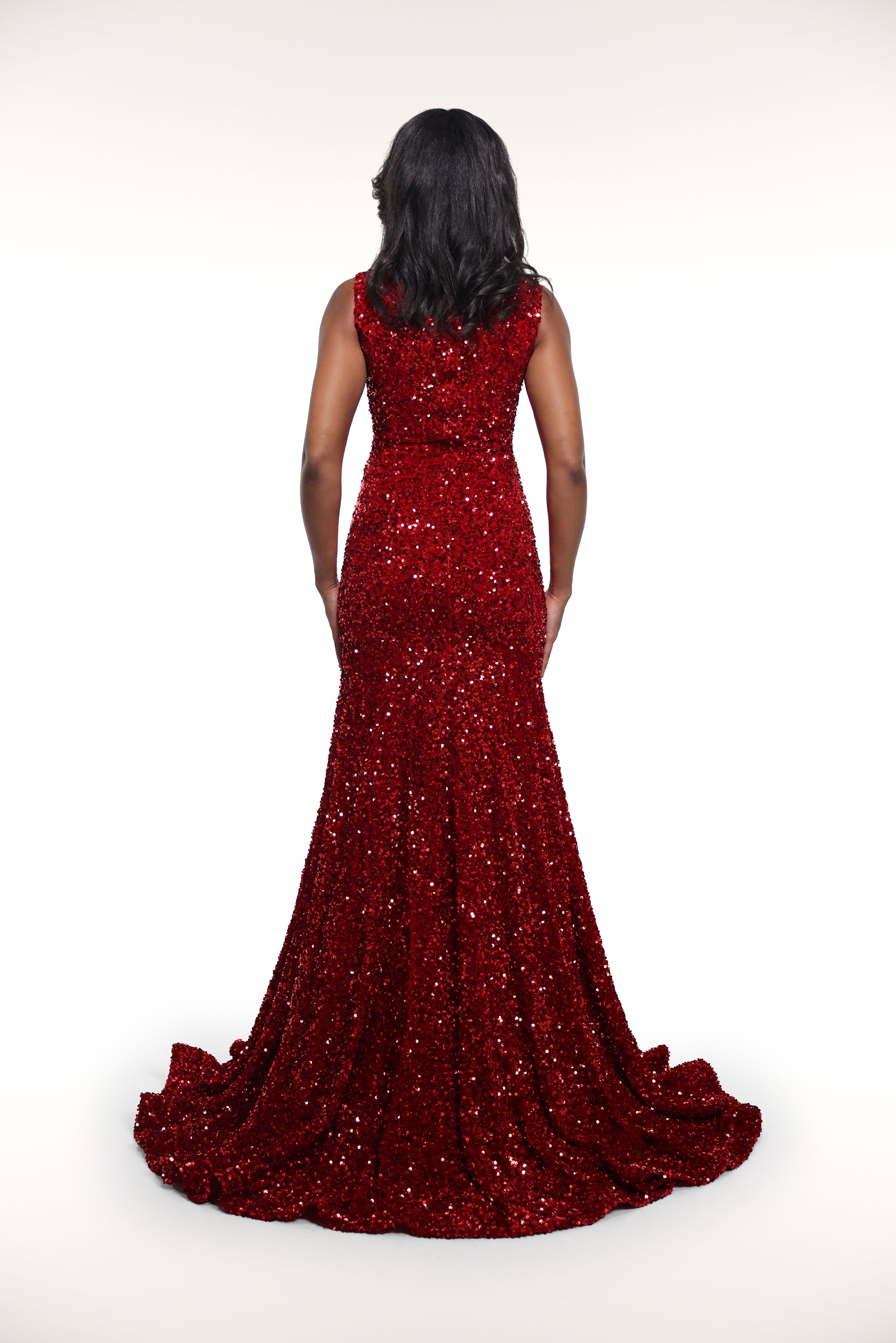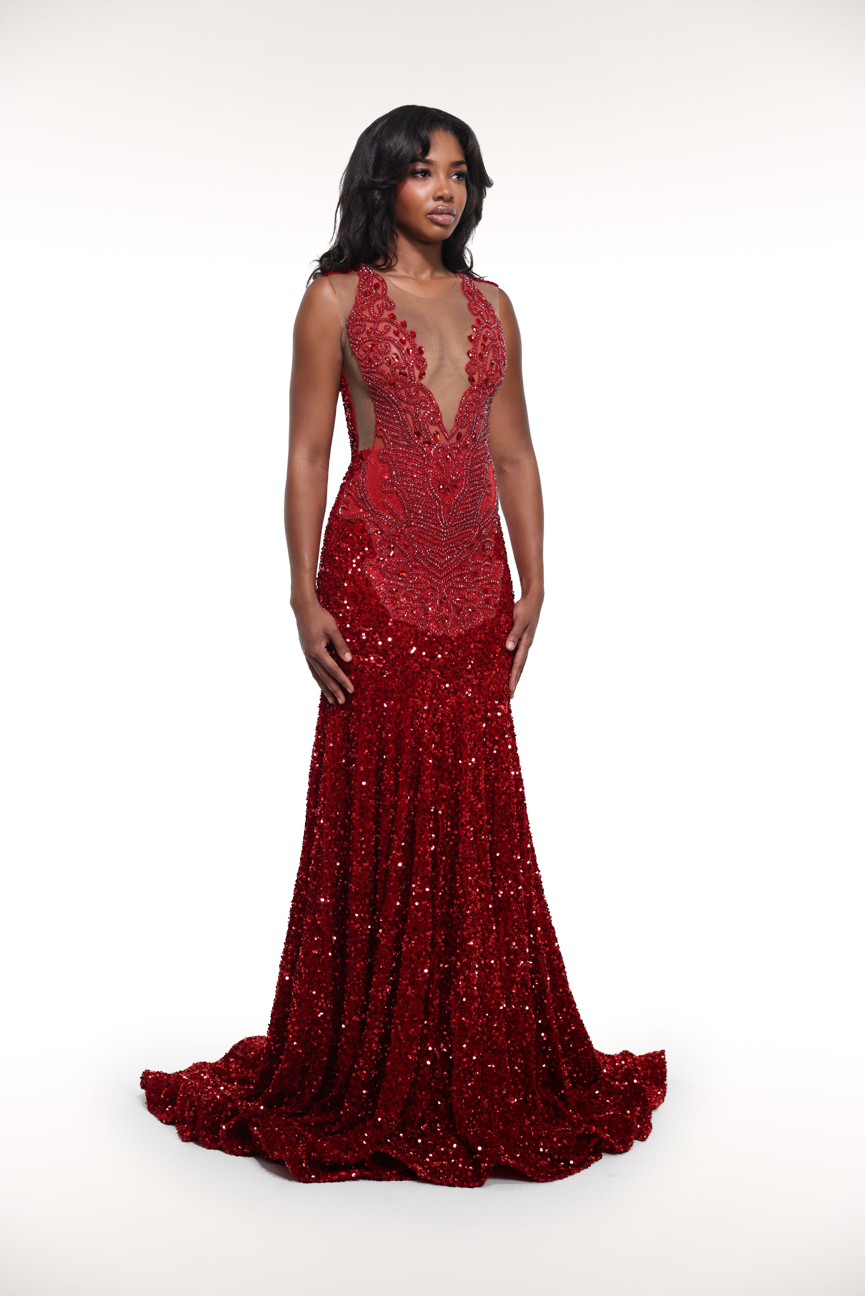Expertly designed 'Rosemary' prom gown features a luxurious velvet sequin fabric with elegant red appliqued rhinestones. The high-waisted coverage enhances the figure, while the zipper back ensures a perfect fit. Make a statement at your next event with this stunning gown.