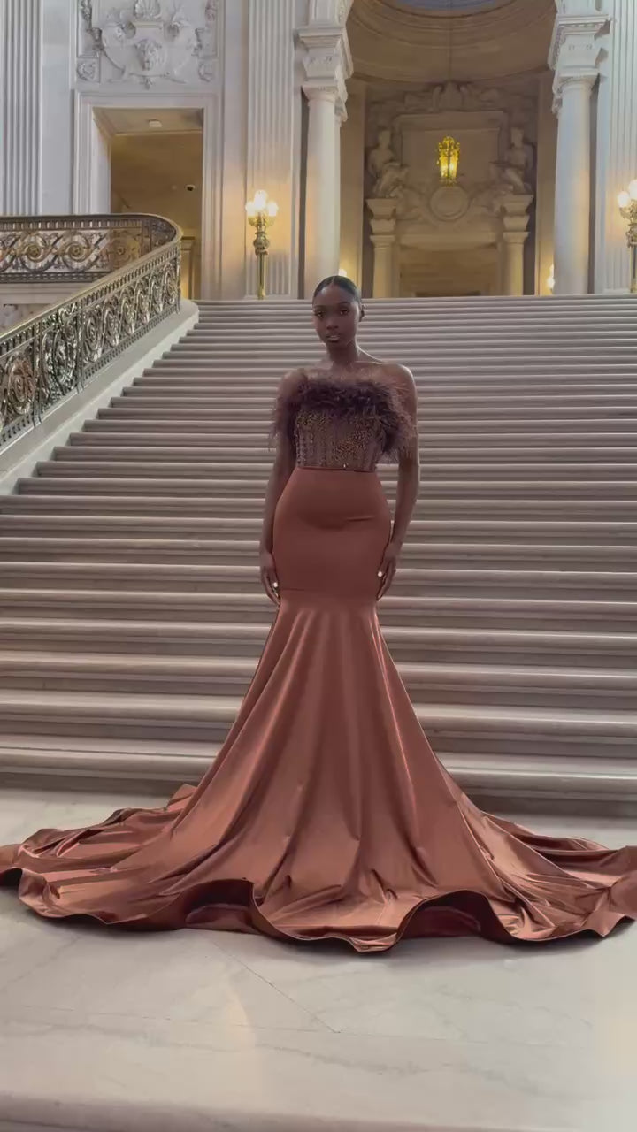 Upgrade your wardrobe with the new 'Kayla' dress. Featuring a strapless design and a beautiful feather detail along the bust, this dress is made with stretchy spandex fabric for a comfortable fit. The corset-style bust is adorned with sparkling rhinestones, adding a touch of glamour to any occasion.